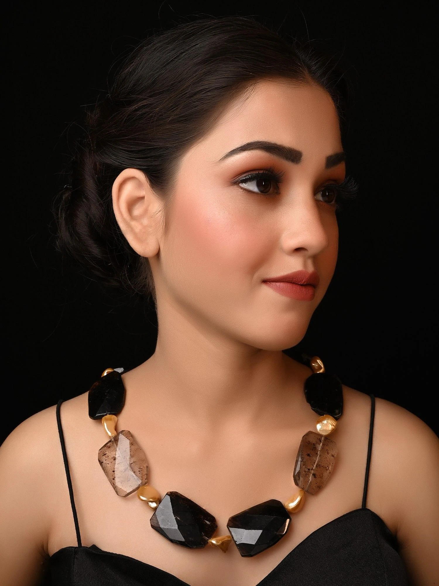 Black Amethyst With Black Onyx Tumbles Weaved With Golden Baroque Pearls To Form A Beautiful Neckpiece With Gold Plated Lock Dimensions : 5 cm x 3 cm (L x W)