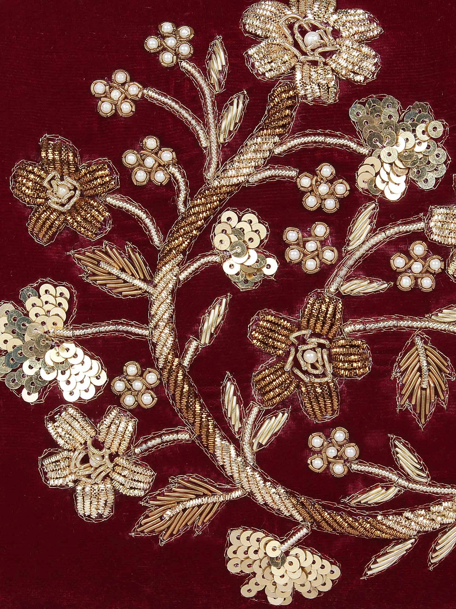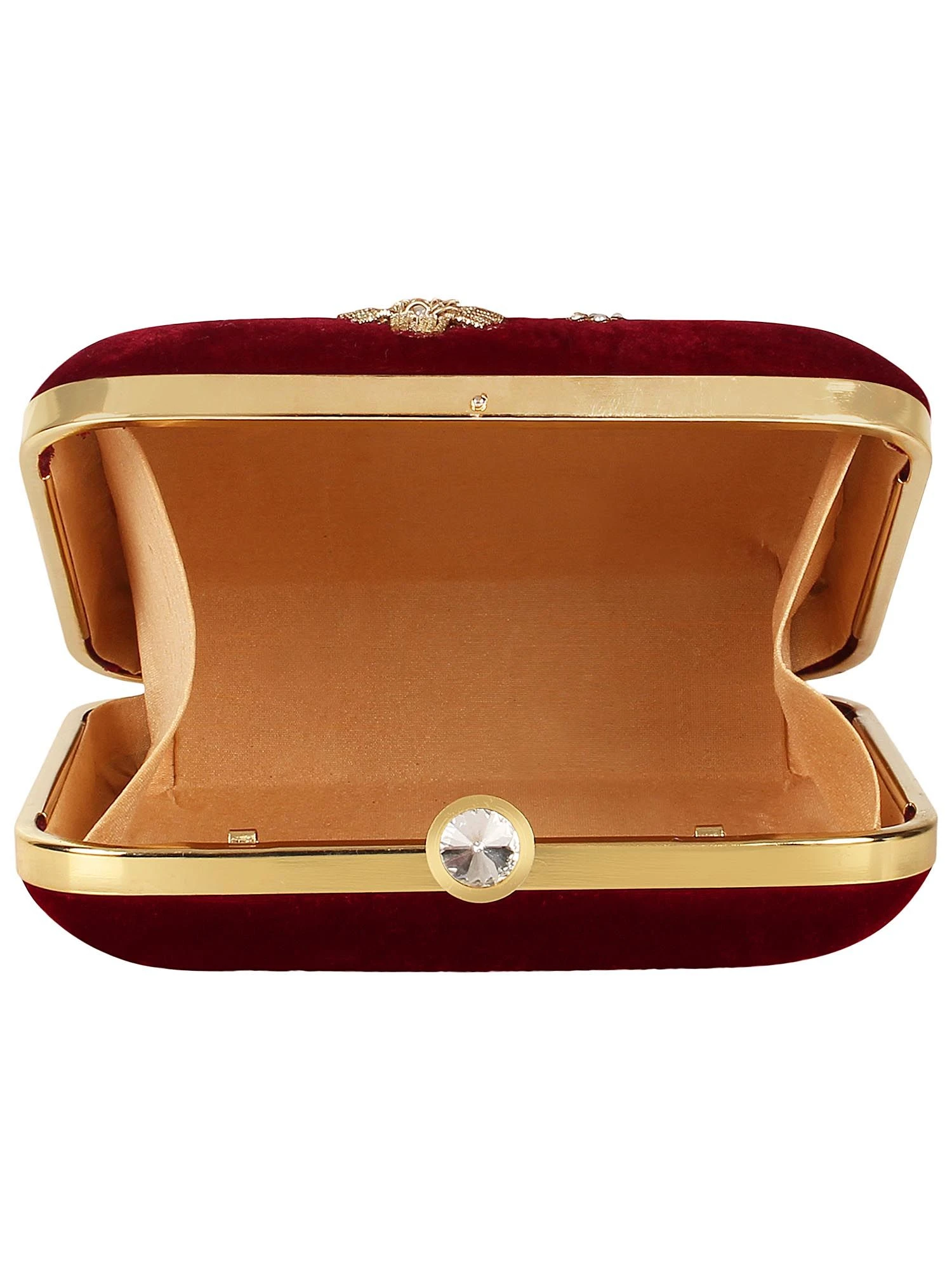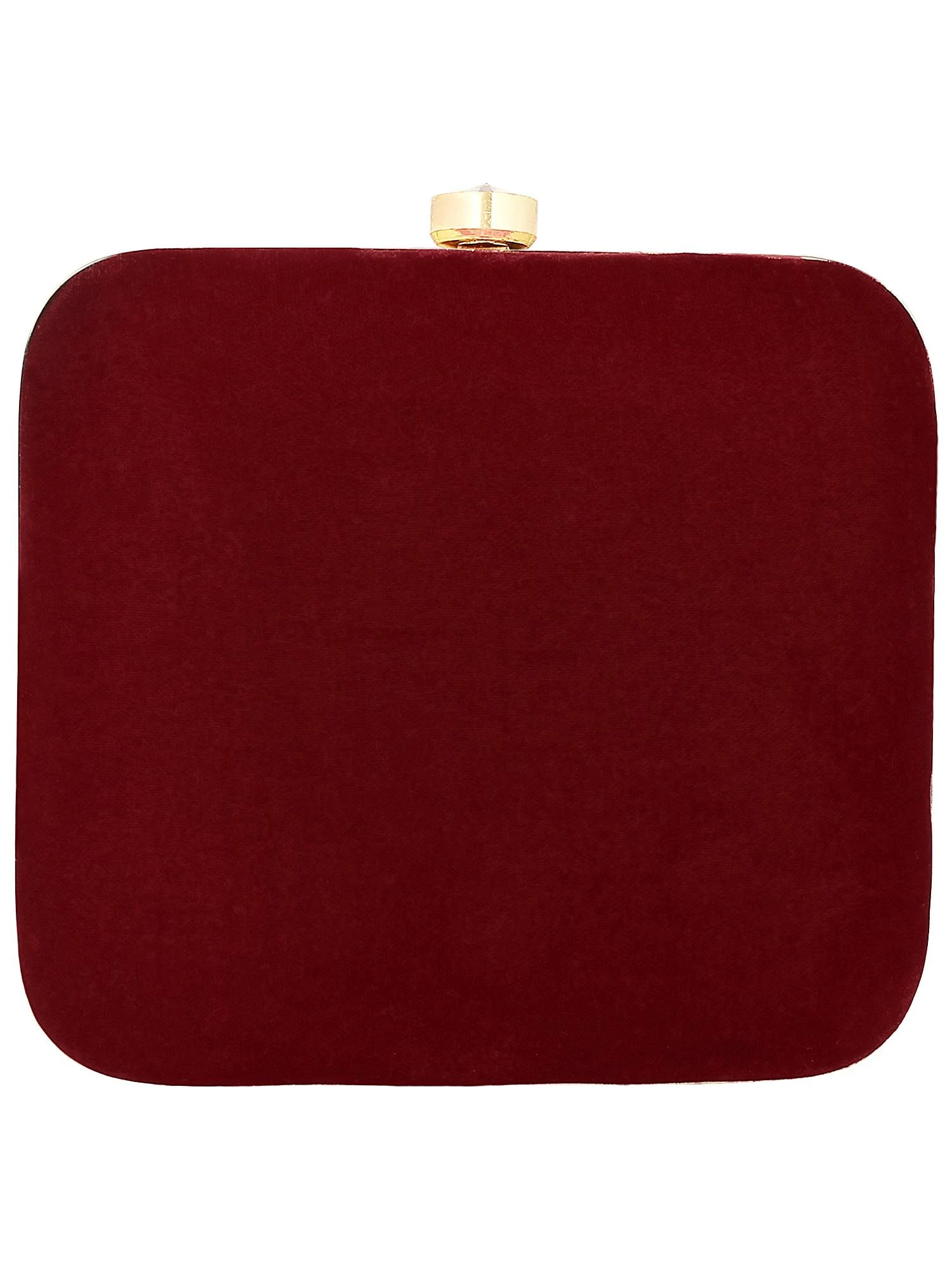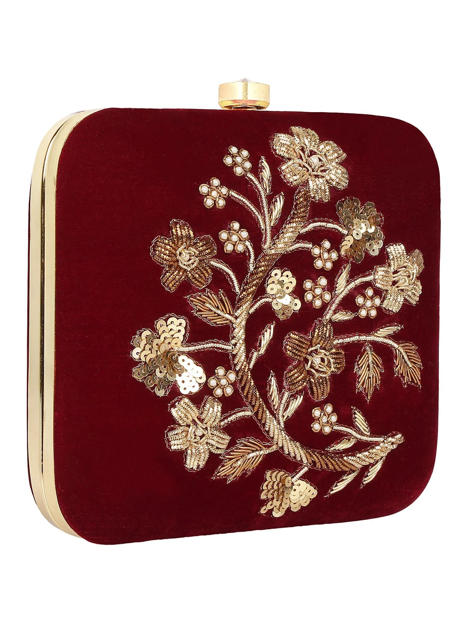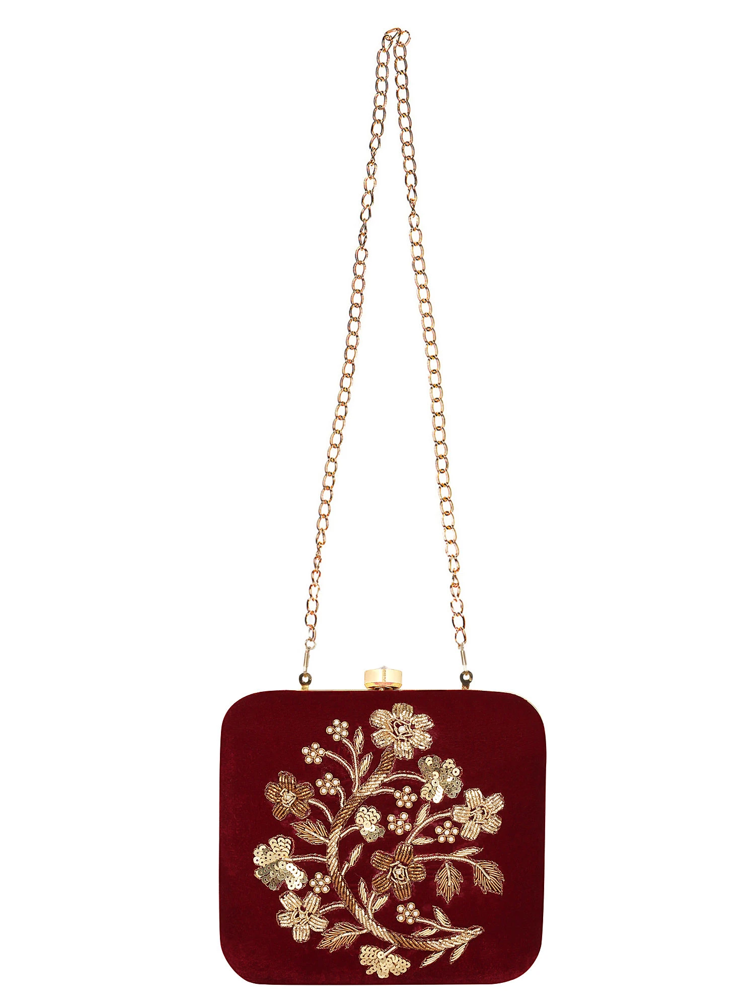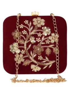 This designer wine & gold hand-crafted velvet square box clutch is embellished with floral sequins work. It has one main compartment with clasp closure and a detachable metal chain. Can also be used as a sling bag.
