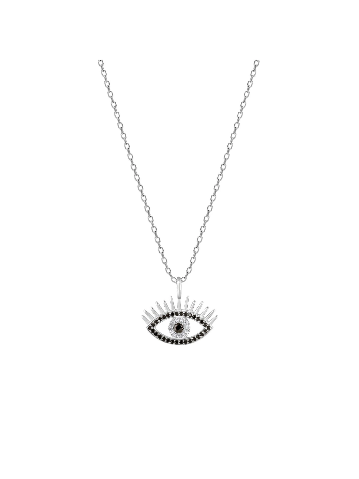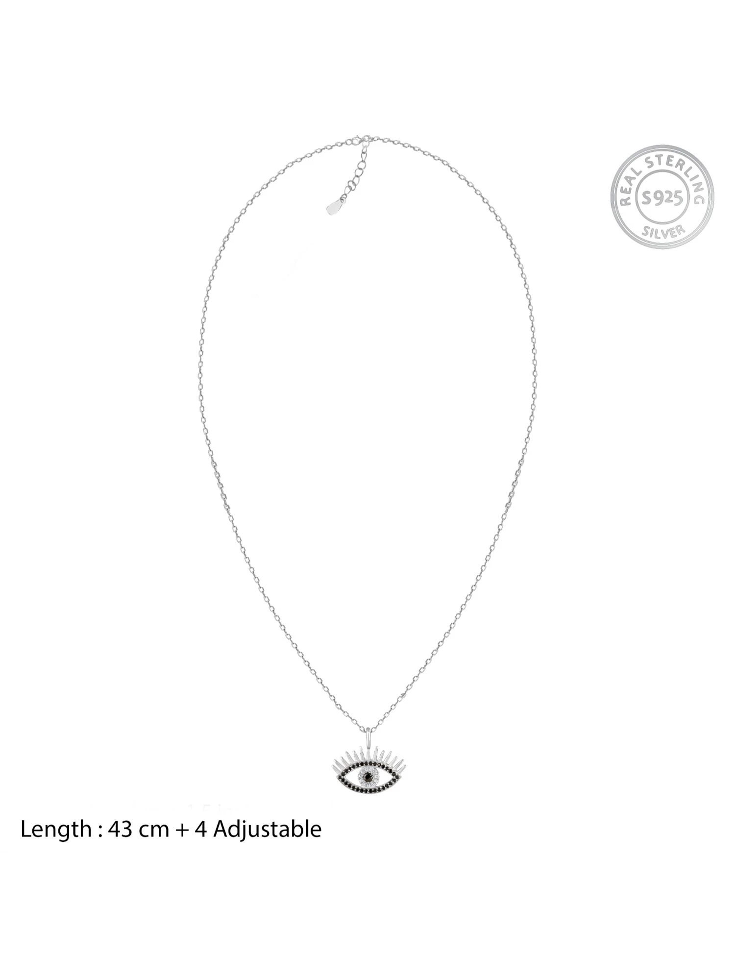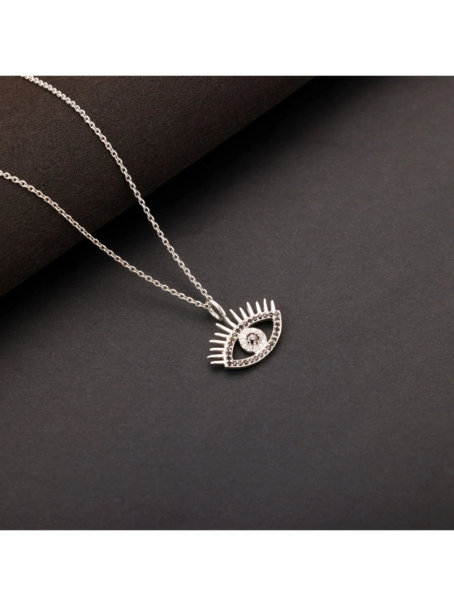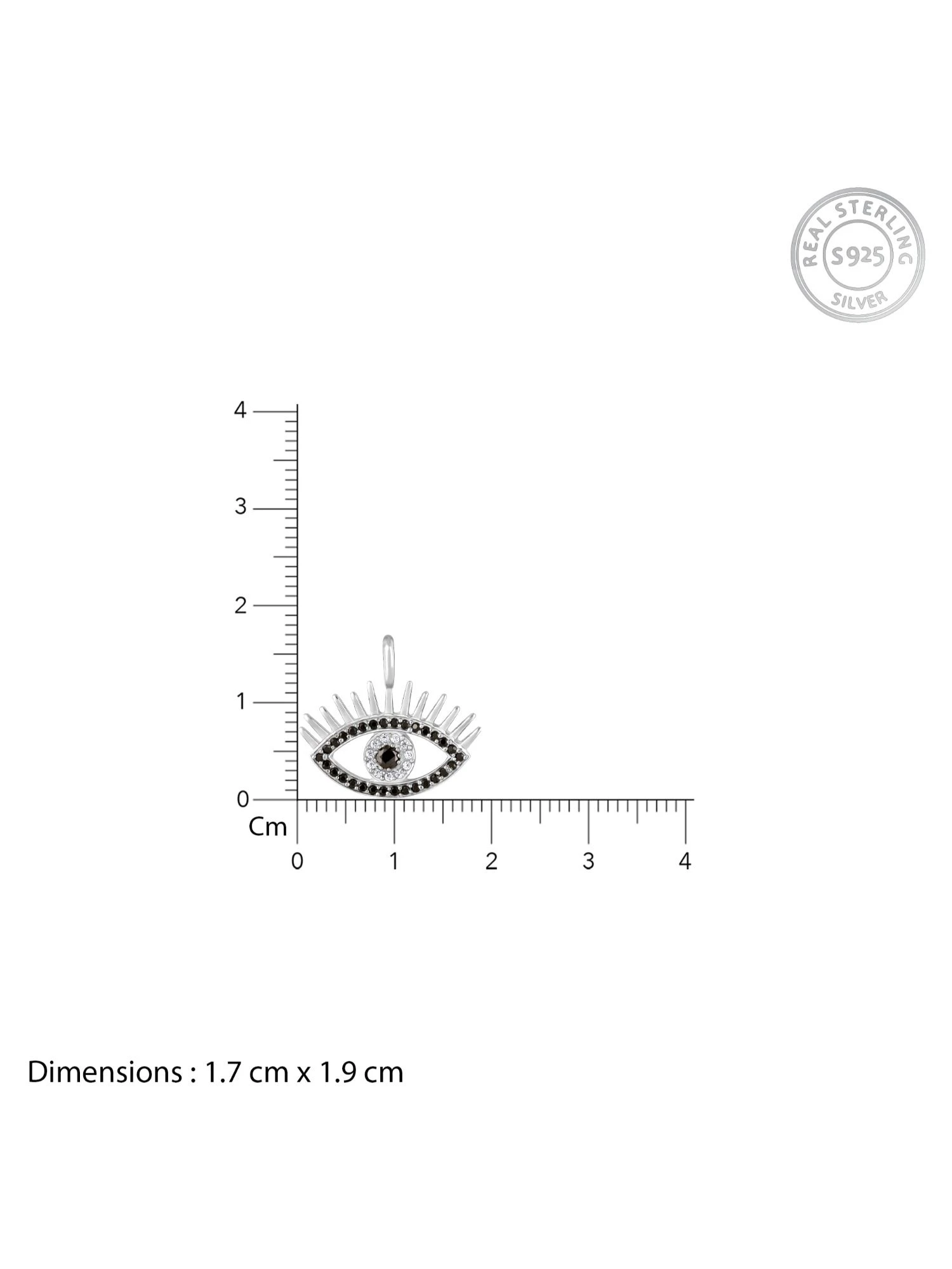 The silver pendant has an eye shaped-design with black and white stones studded on it. The pendant also has an eyelash-like design made on top of the eye structure.