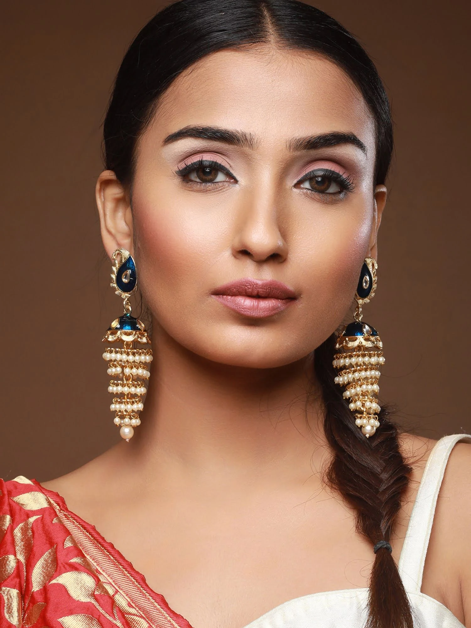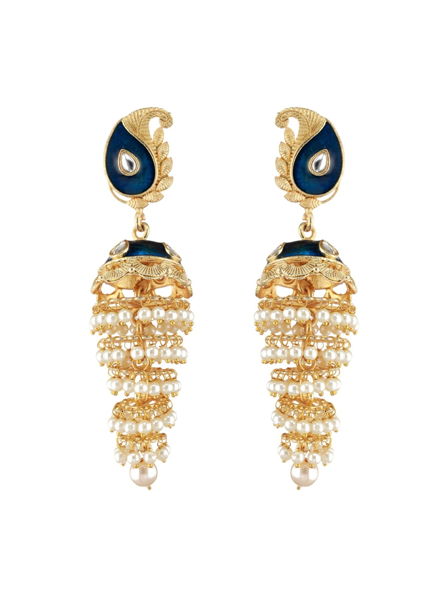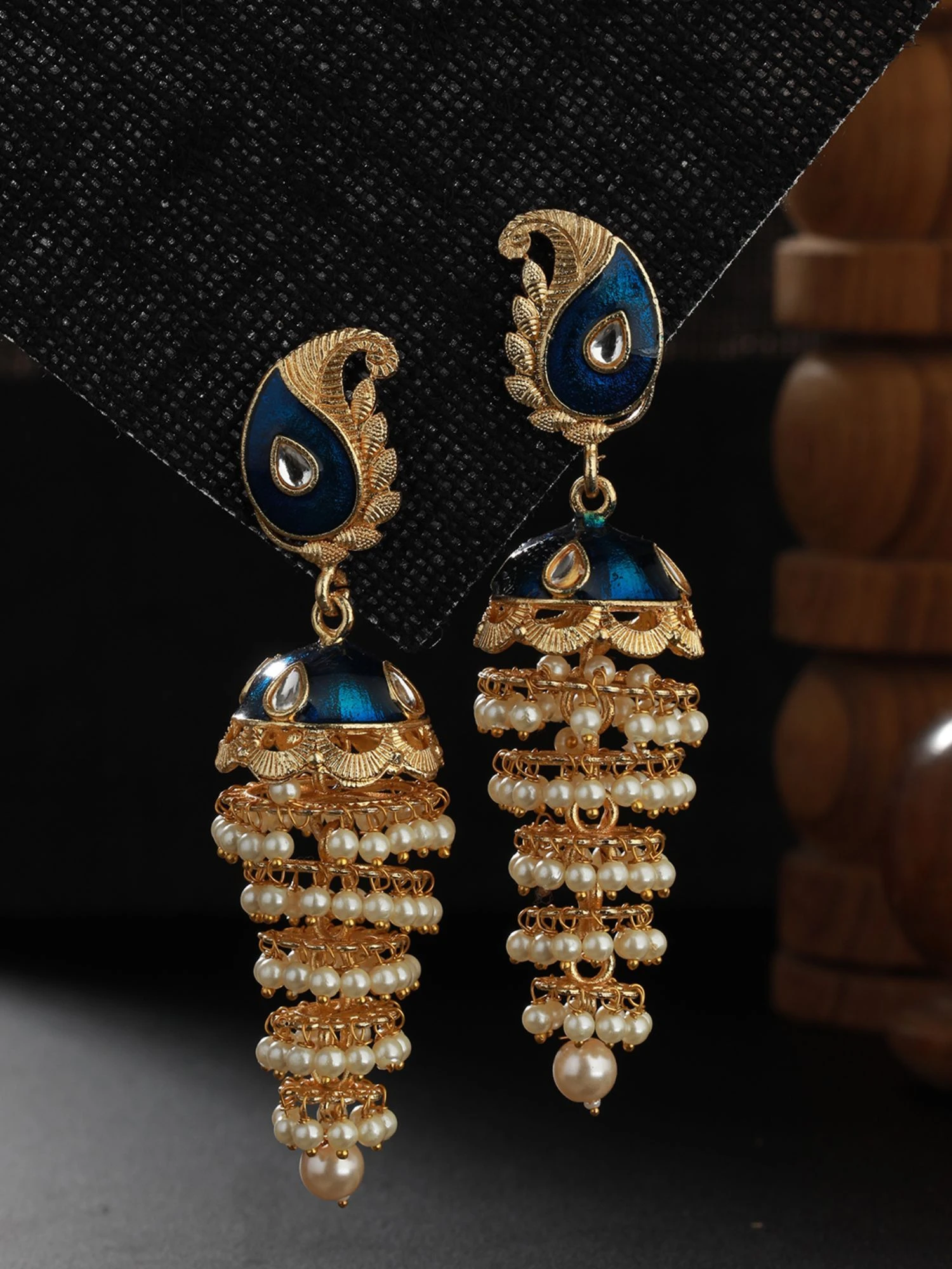 Blue Gold-Plated Kundan-Studded & Meenakari Jhumkas Earrings, Secured with Push Button Closure. Class trend. Fit with all Kinds of Trendy attire. Can carry on all types of Occasions Dimention – 9 x 3 cm (L x W)