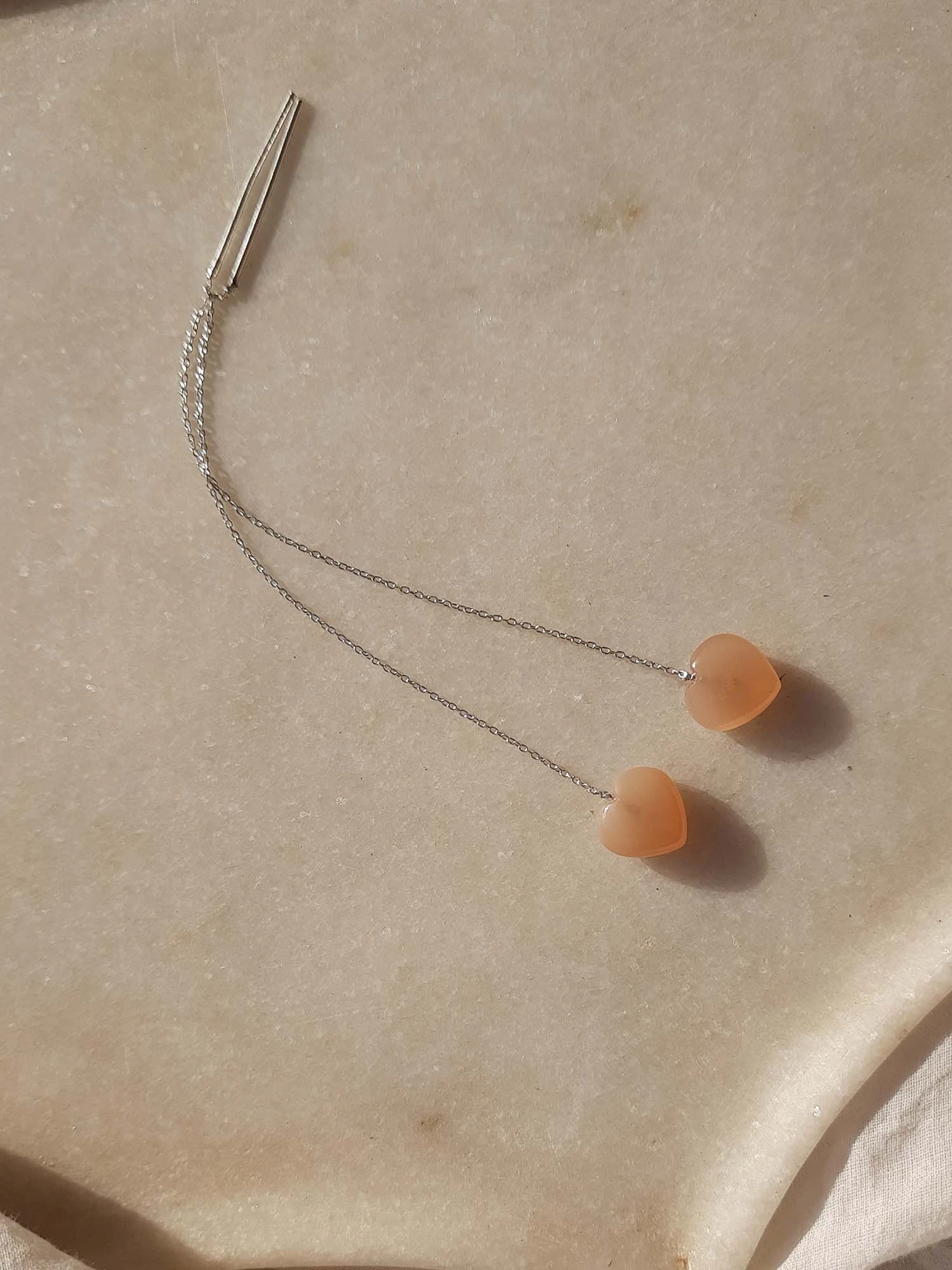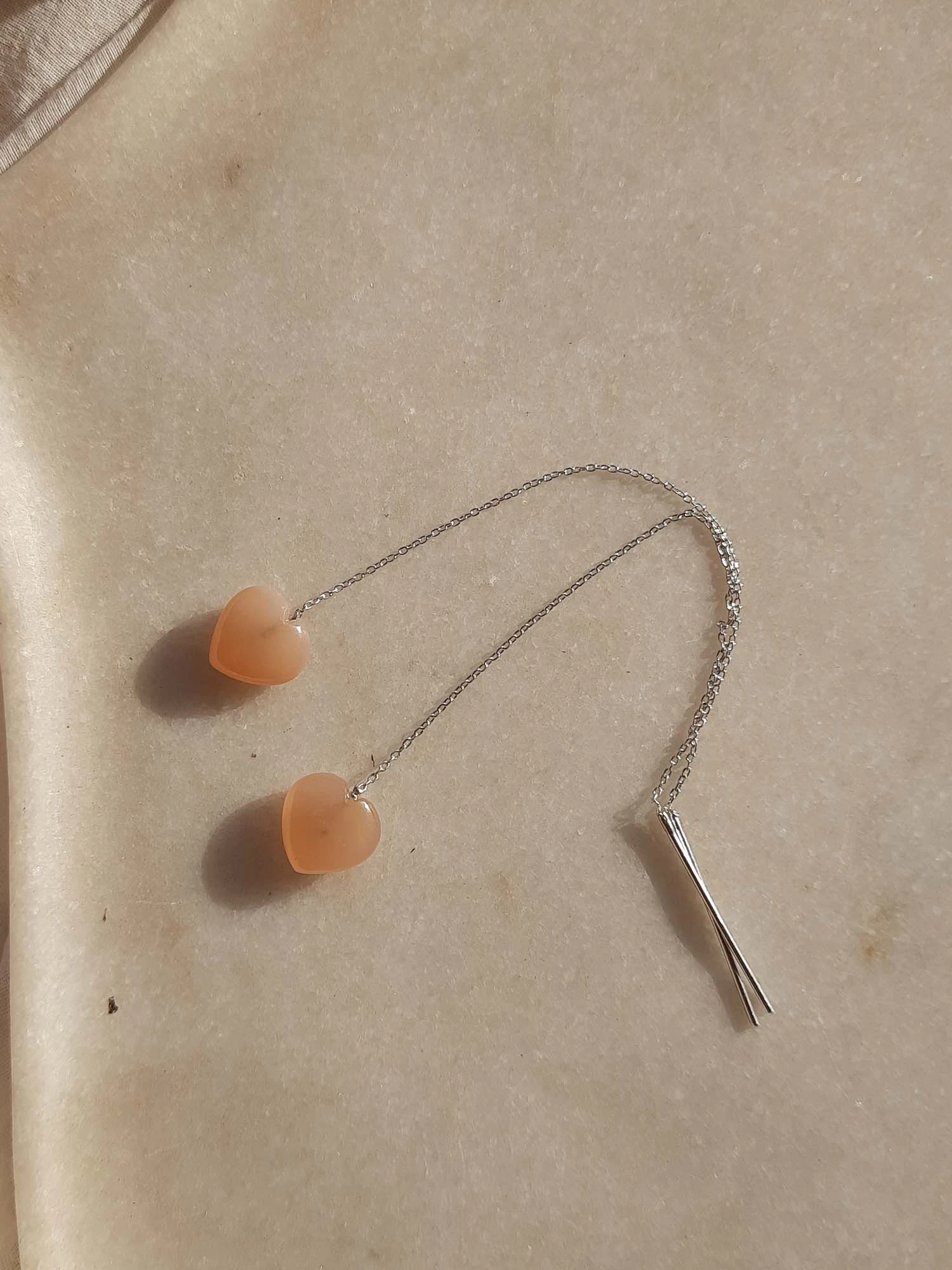these earrings are made from fine quality peach moonstone gemstone, was hand carved in a heart shape and finished using sterling silver findings.