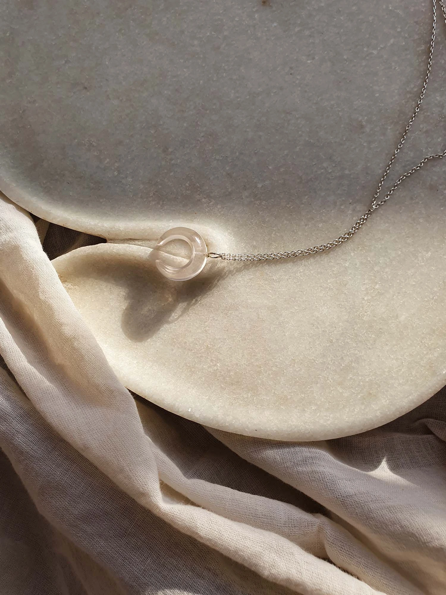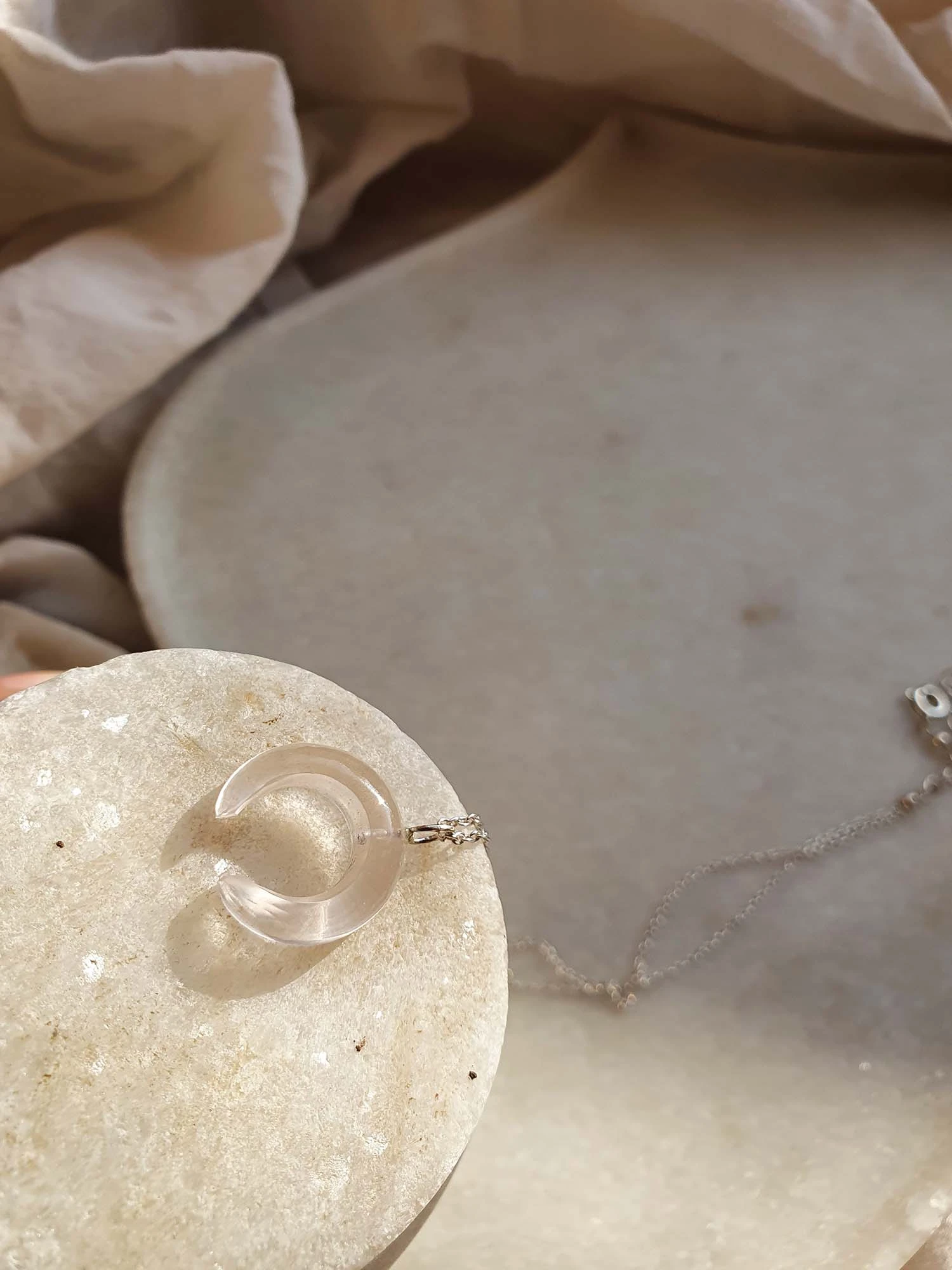 this pendant is made from fine quality light pink rose quartz gemstone, was hand carved in a full moon shape and finished using sterling silver findings.