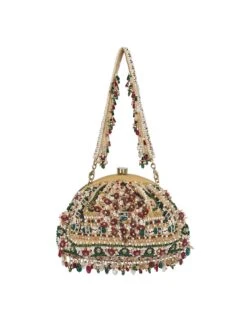 Inspired by opulent encrusted legacy jadau and polki jewellery, the amara soft pouch ruby emerald is embellished with semi-precious rubies, emeralds, stones, nuggets with kundans and lustrous gold silver japanese beads. it is finished with delicate asymmetrical handmade tassels at the bottom. the addition of our signature embellished handle makes it a statement piece. this collectible statement accessory fits in your valuables like a smartphone, makeup, keys, currency and cards. usage: