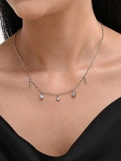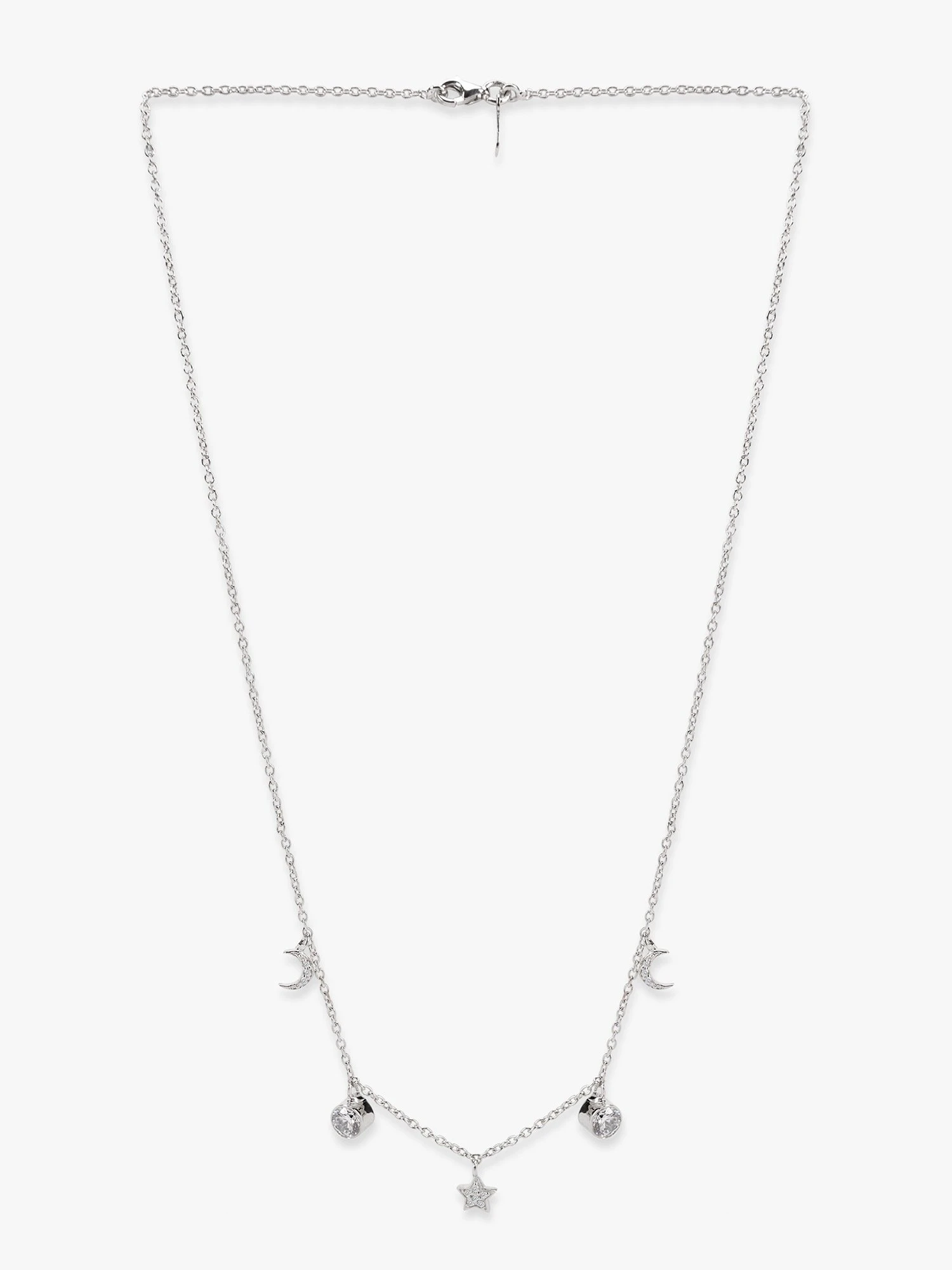 Feel classy and chic wearing this minimal sterling silver charm necklace featuring star and moon studded with zircons. This necklace is lightweight and has a lobster lock.- Sterling Silver with Rhodium plating and 925 hallmark. – AAA+ quality zircons. – Rhodium e-coating to prevent tarnishing. – Comes with authenticity certificate.