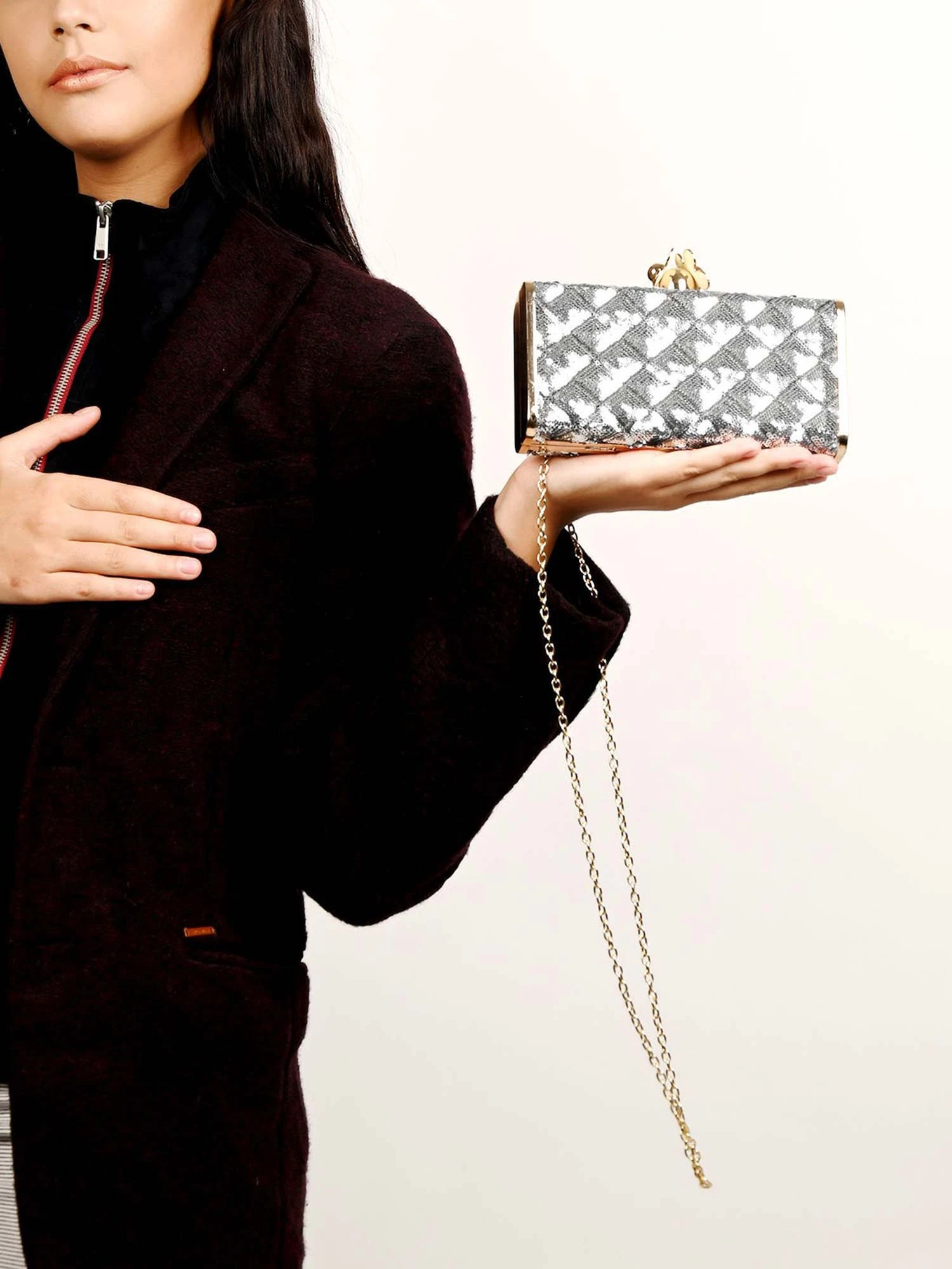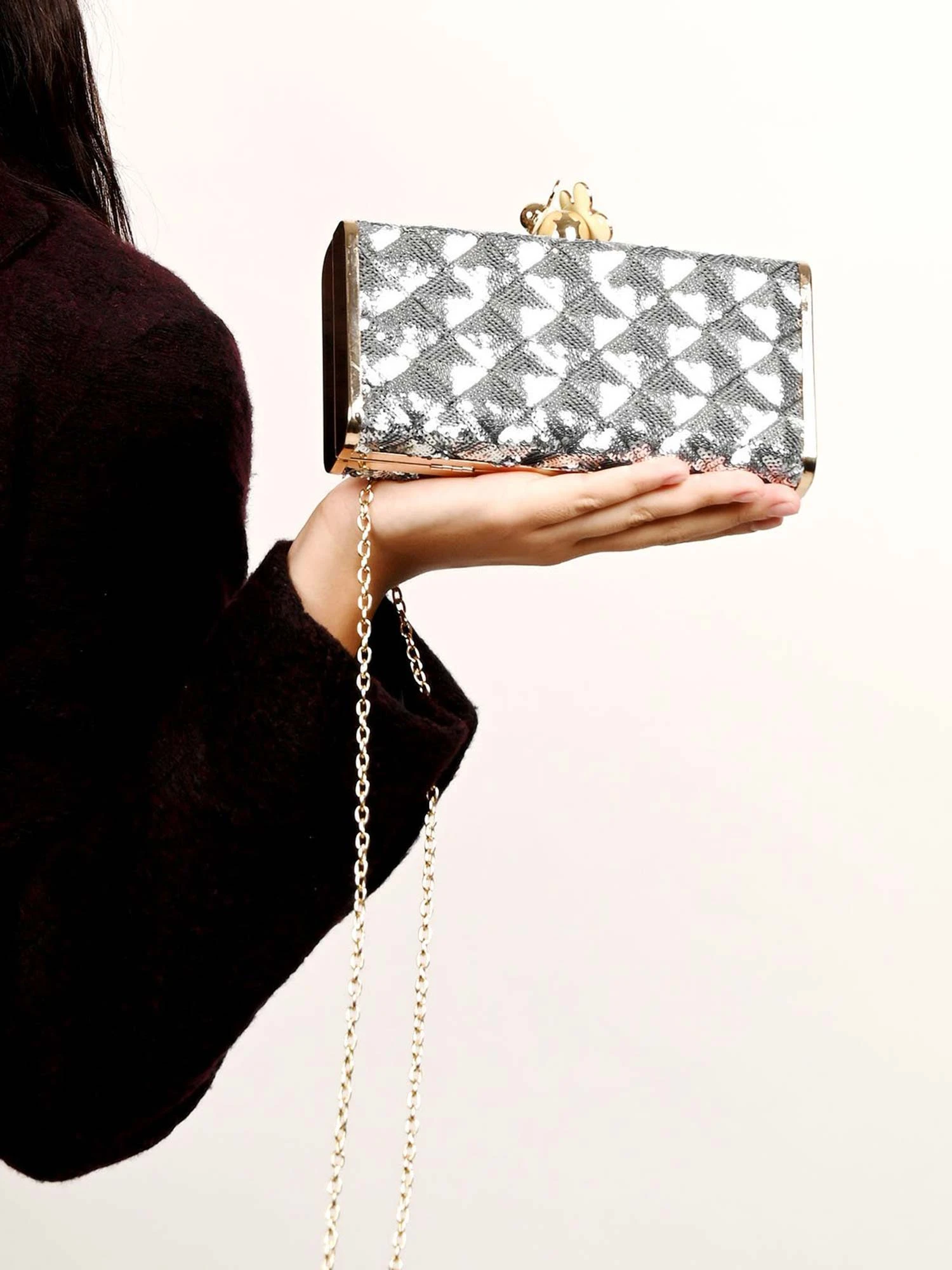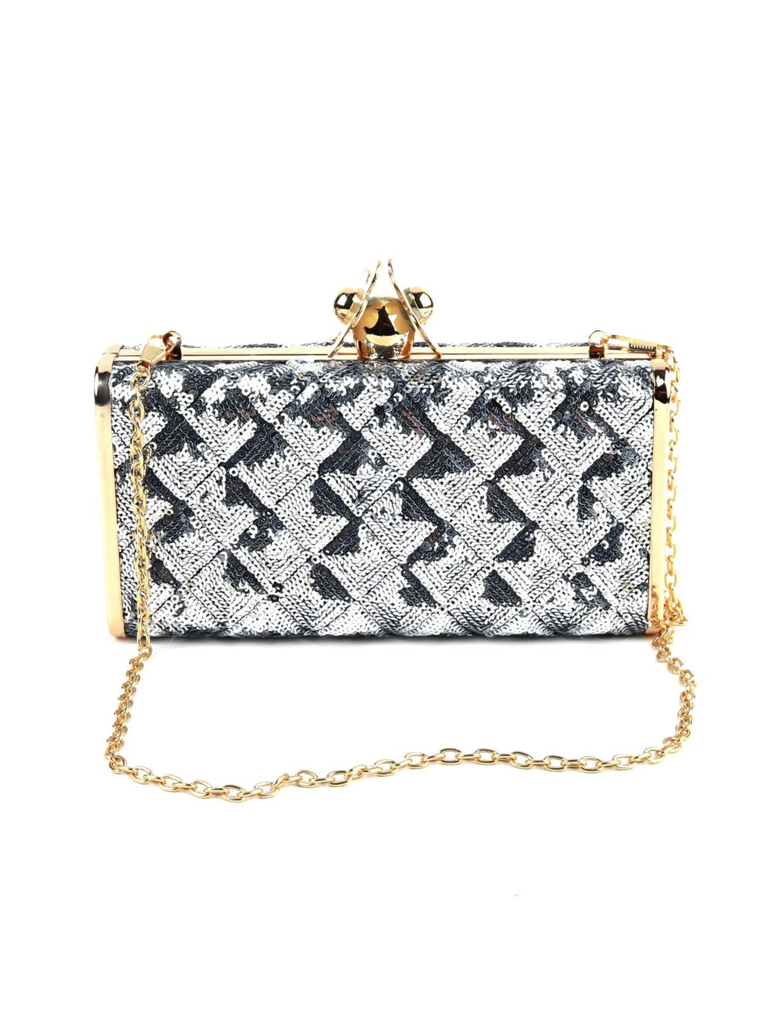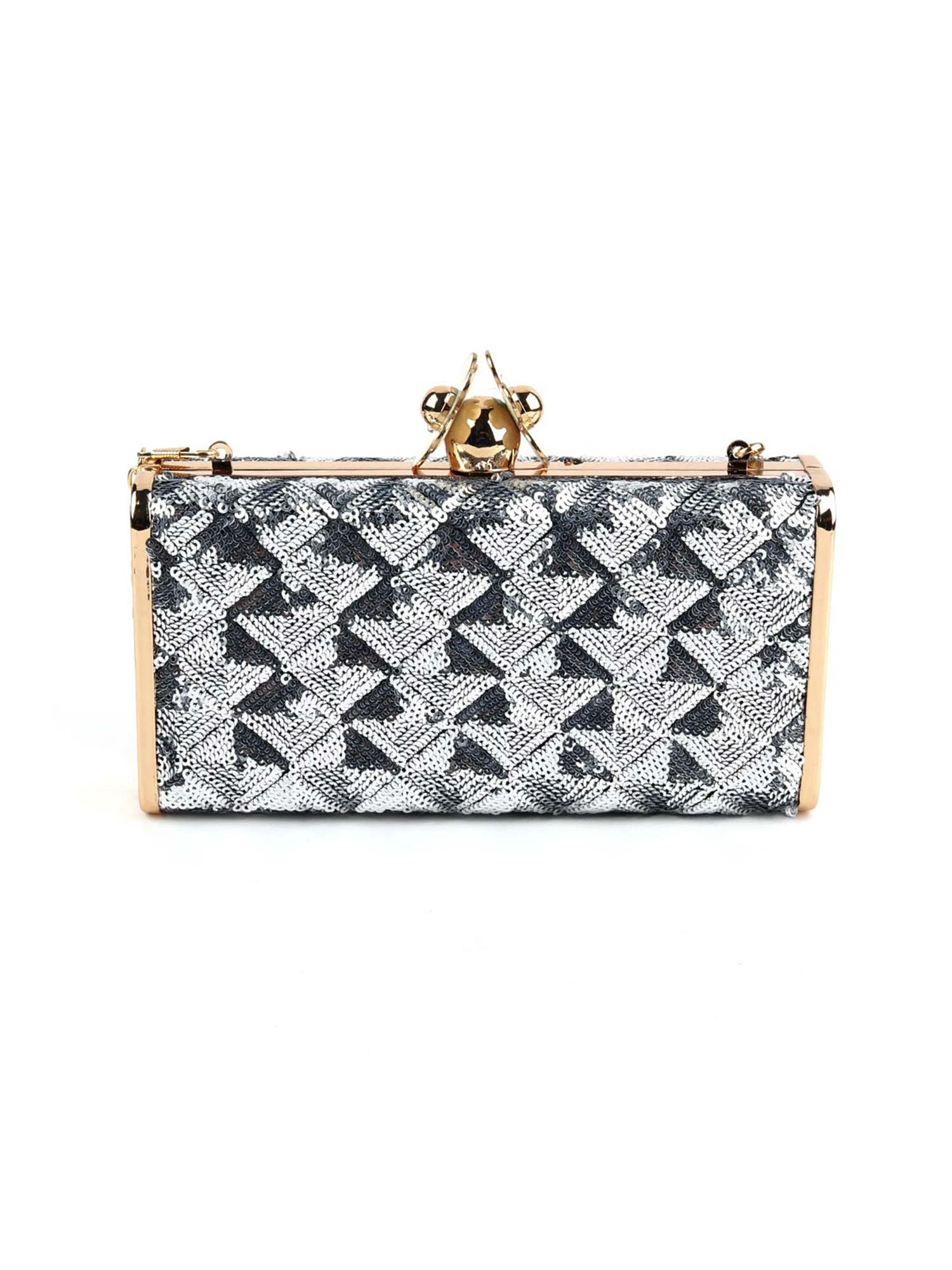 Adorn elegance to your aesthetic ensemble with this grey clutch by Odette. This boxy clutch featuring a metallic rim with tiny sequins and a non-detachable long chain is perfect for your next date night. Wear it with your peep-toe heels and a stunning dress. Dimensions: 29 x 22 x 13, Warranty: No Warranty, Water Resistance: Not Water Resistant, Handles: No, Closure Type: Turn Lock