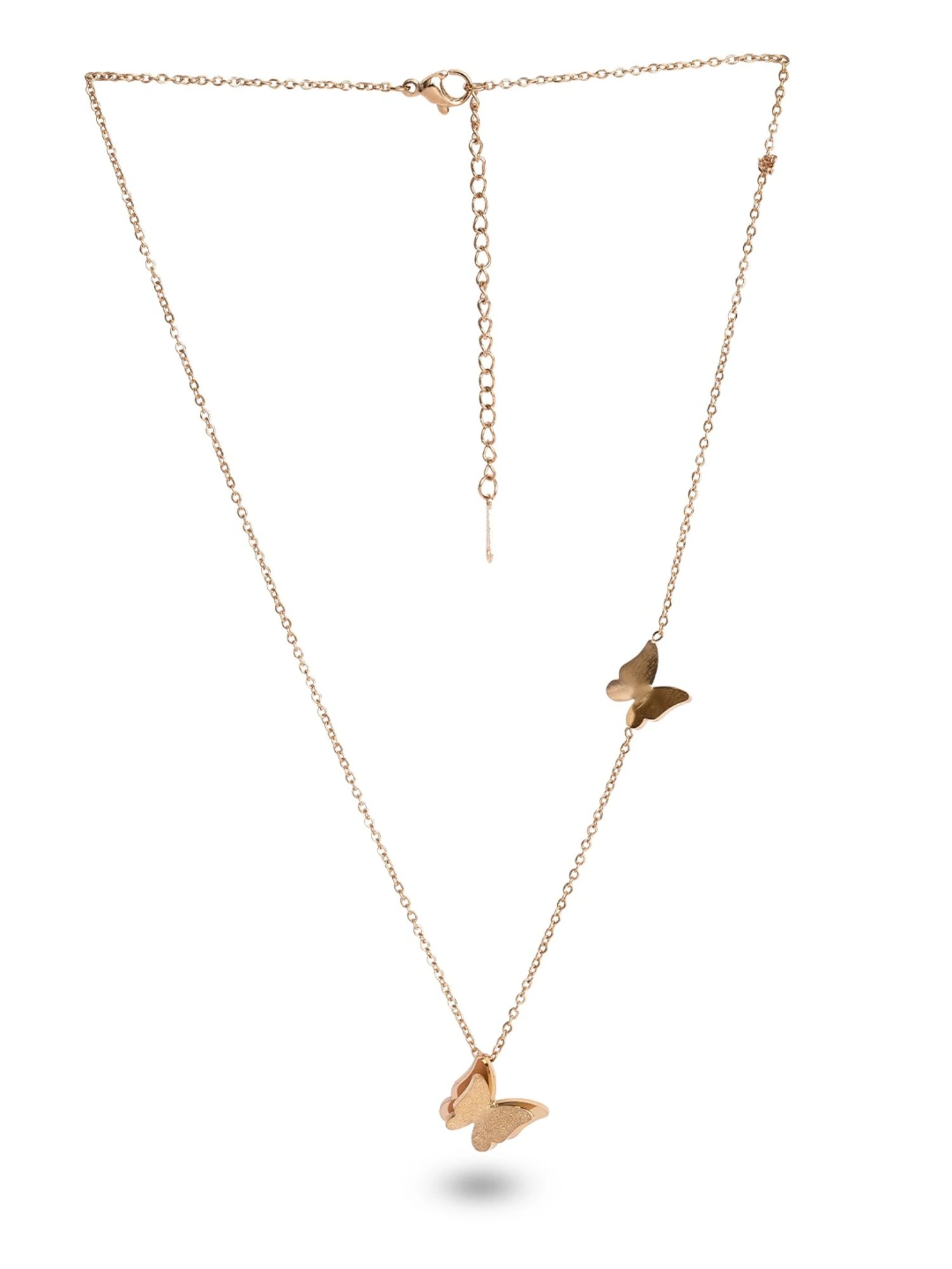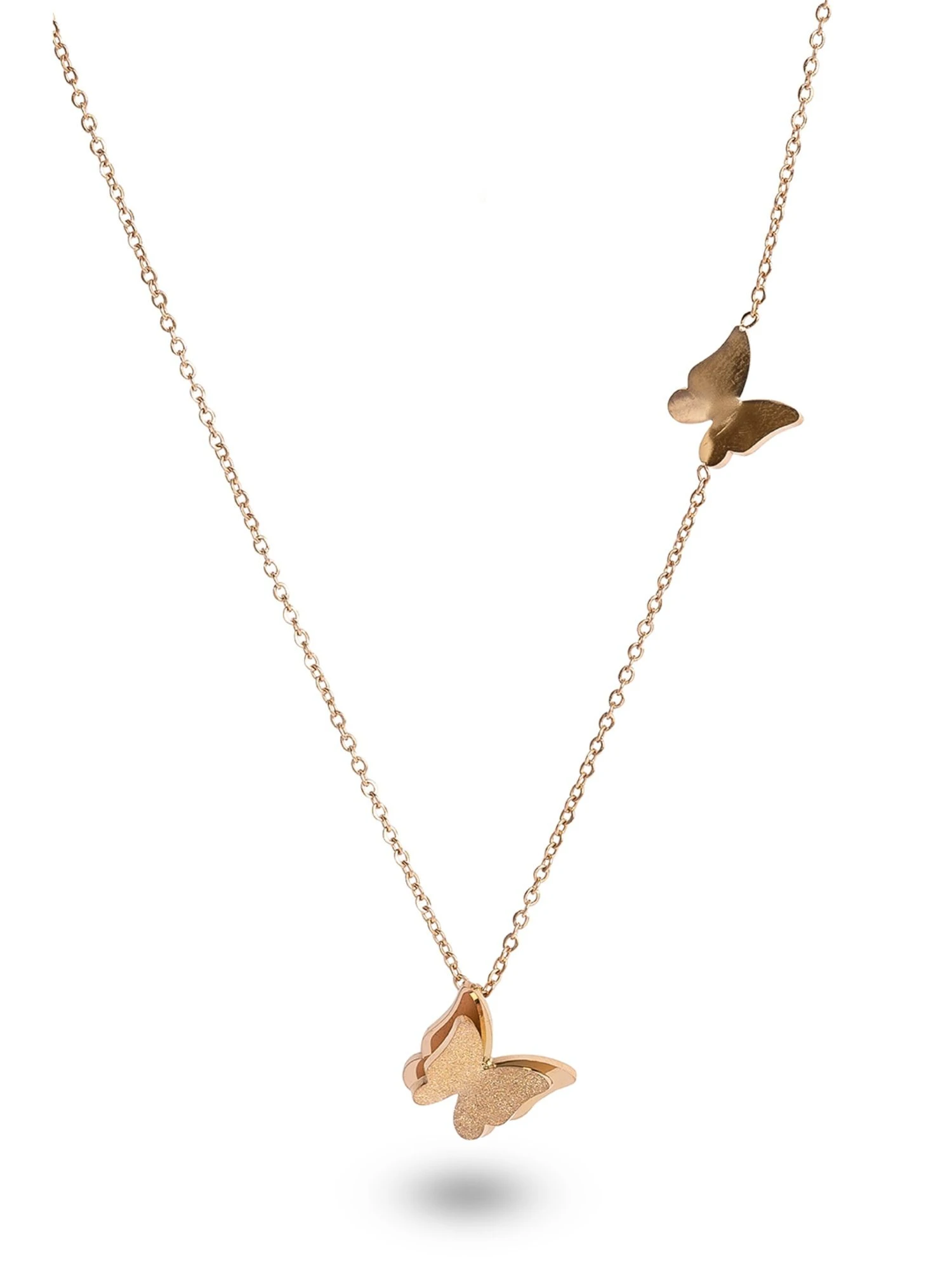 Two small butterflies may be seen on this lovely necklace. The Ella Butterflies Necklace features two tiny, artistically designed butterfly pendants that may be adjusted in size. A 12-month warranty from Palmonas covers the replacement of your jewellery. The handcrafted box in which the Ella Butterflies Necklace is delivered is ready for gift-giving. The original invoice must be presented for any relief. The Ella Necklace with Butterflies is plated in 18k rose gold.