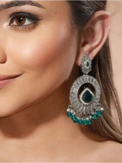 Discover the perfect pair of earrings with Priyaasi. These silver earrings are crafted in a round floral drop design adorned with finely-cut mirrors, American diamonds, sea-green color stones, and beads. They have an intricate pattern exquisitely crafted by skilled craftsmen and an excellent finishing and detailing to make you look and feel beautiful.