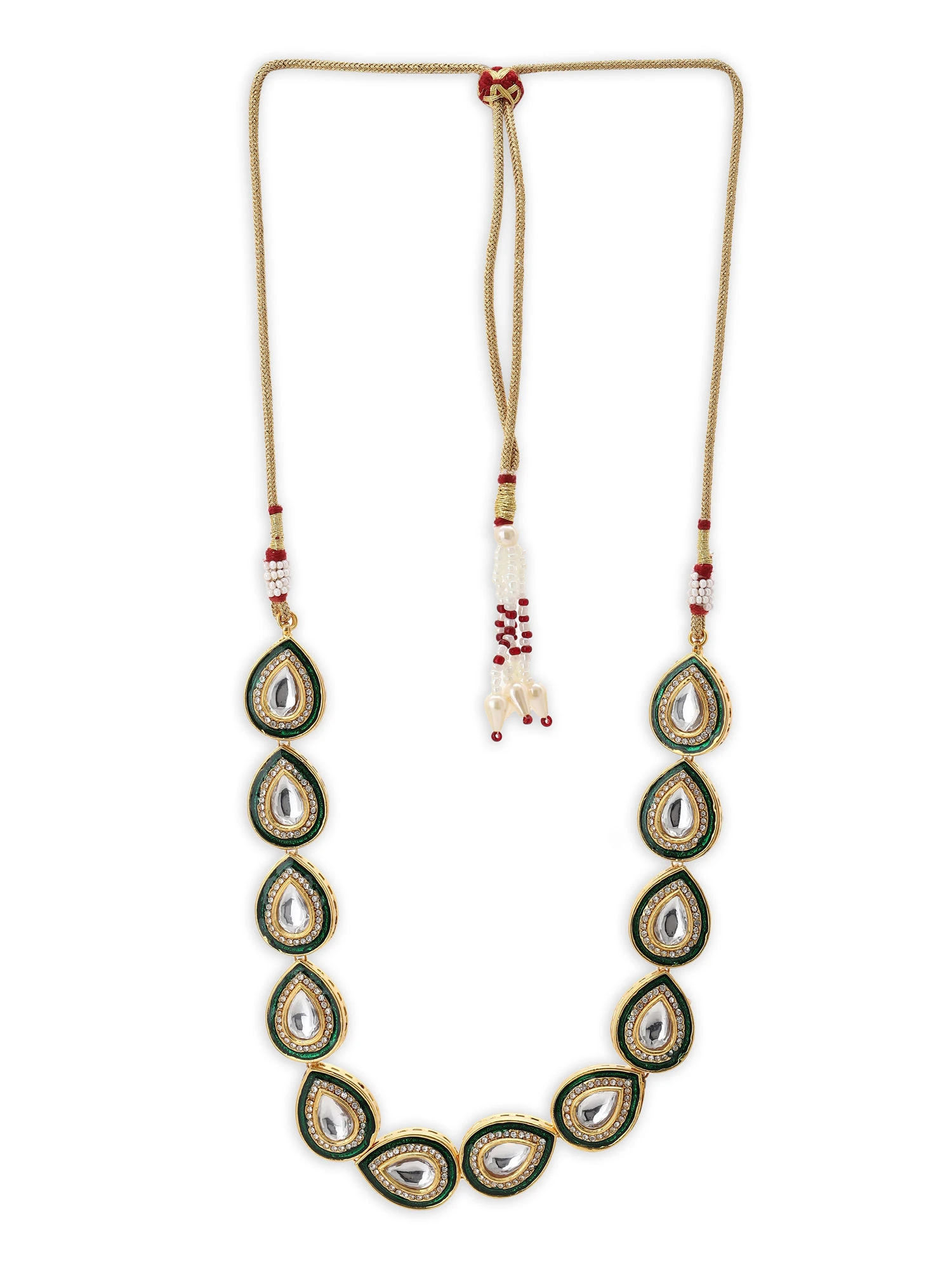 The theme of this choker necklace is resplendent with simplicity and sobriety. The necklace is adorned with crystal-like faux stones and their ethereal sparkle with a gold-plated metal base that perfectly amplifies the charms and shine of the gems. This piece features meticulous arrangement and design of stones and meenakari work that embrace your neck in a sumptuous grace. Each arrangement sports a pear shaped glistening faux stone in the middle, surrounded by halos of gold-plated metal, tiny glittering faux stones in circular cuts, and a majestic meenakari work in dark green. The sleek and minimalistic appeal of the necklace is a must-have for any woman’s wardrobe.