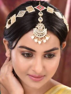 Saraf RS Jewellery Gold Plated Ad Studded Pearl Beaded Bridal Matha Patti With Maangtika