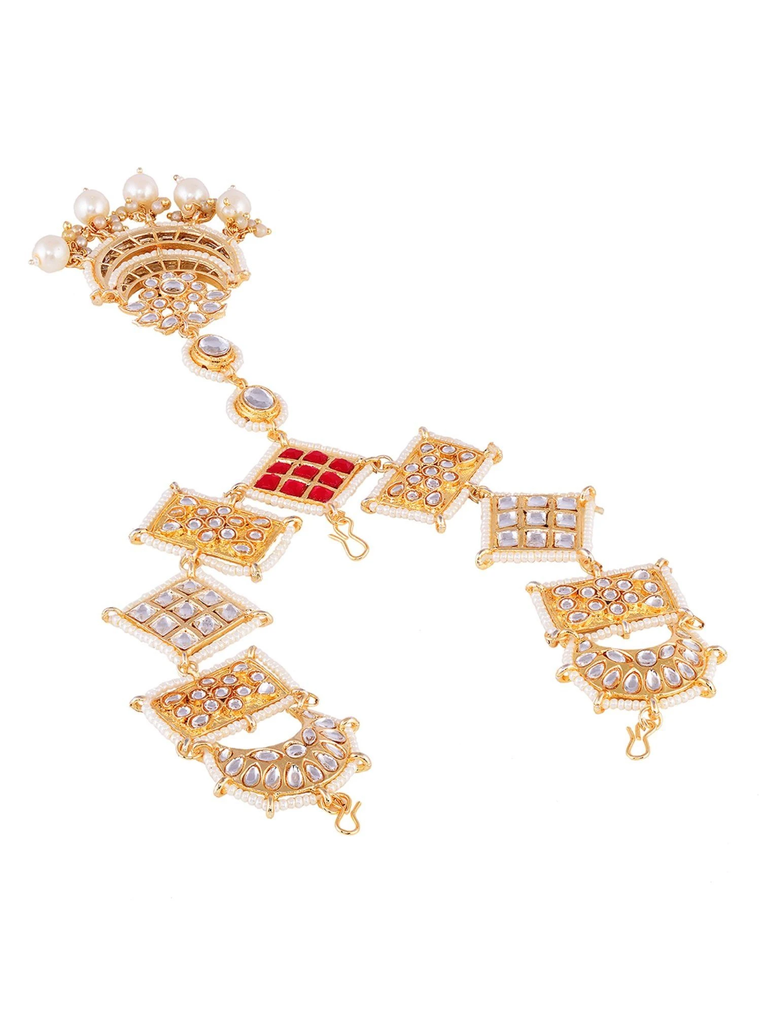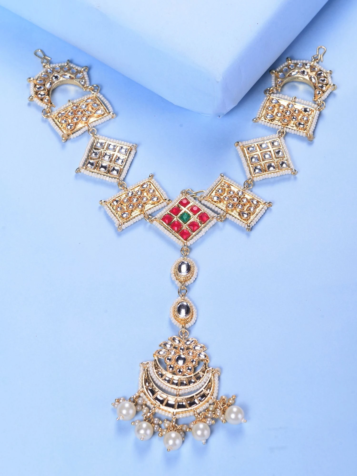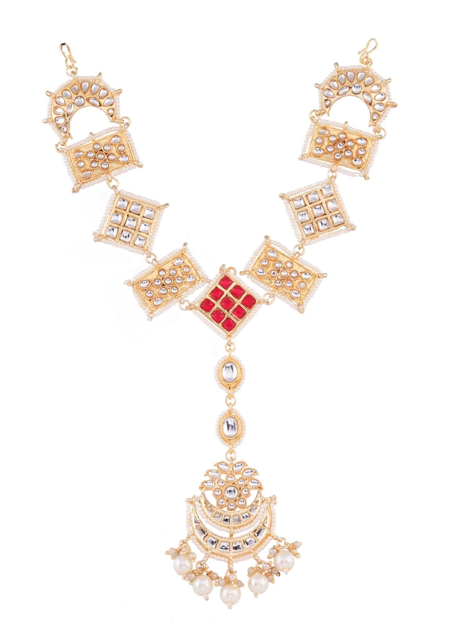 Elevate your outfit by wearing this red matha patti from Saraf RS Jewellery. Made with a kundan design, it will turn all heads. Tag with your next party outfit.