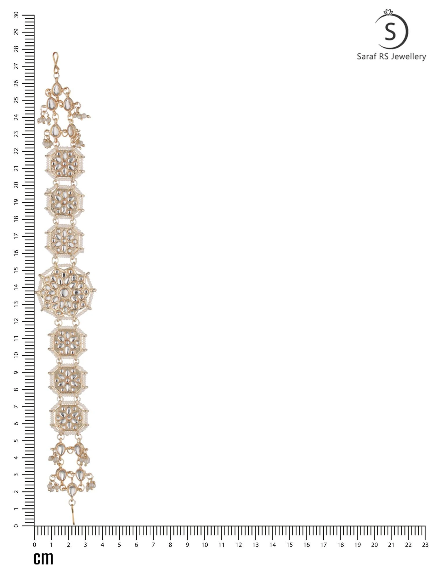 Take your look a notch up with this embellished headband. Its eye-catching design studded with Kundan stones is sure to uplift your look. Style it with a statement necklace and an evening outfit to steal the spotlight.
