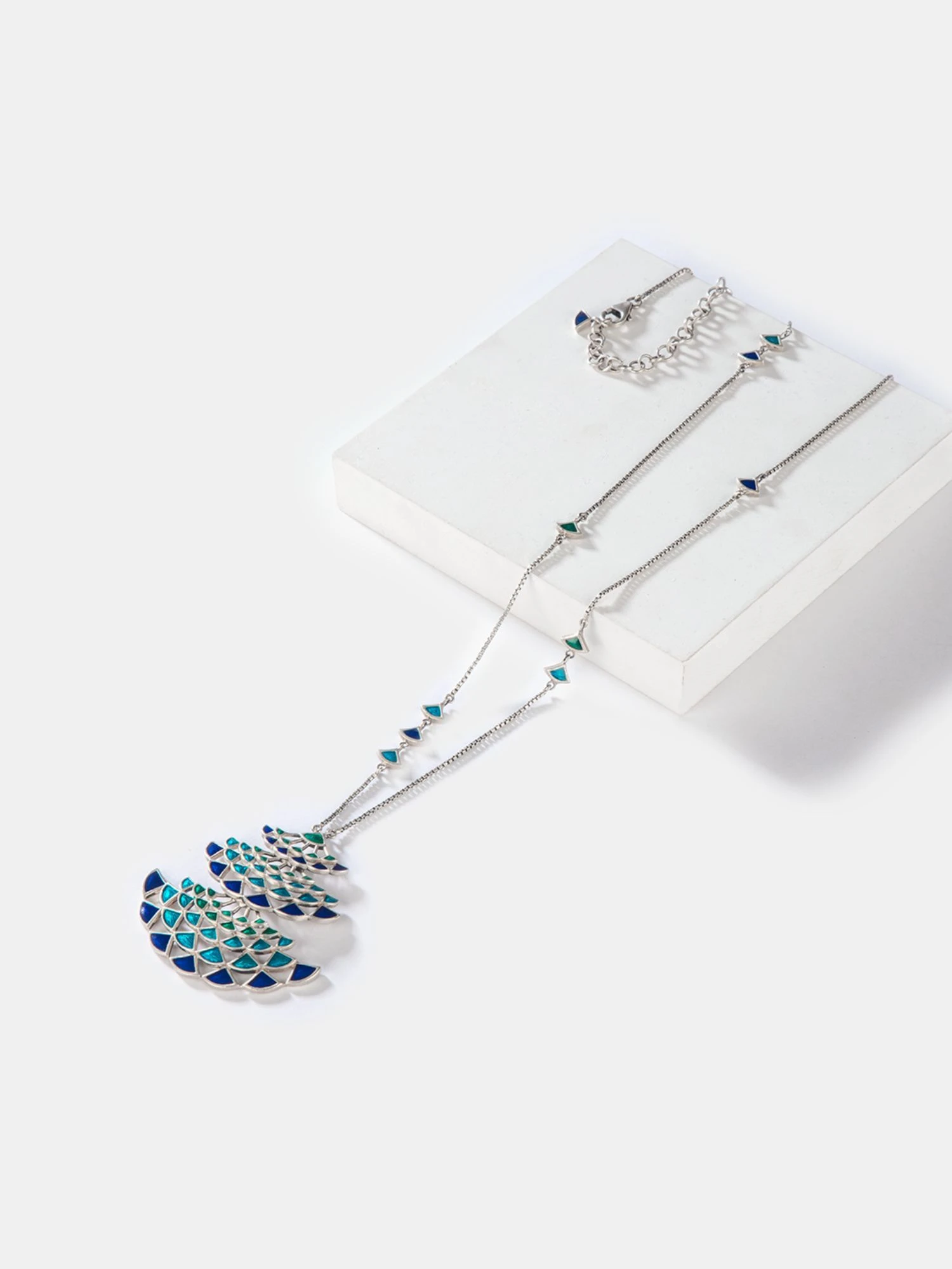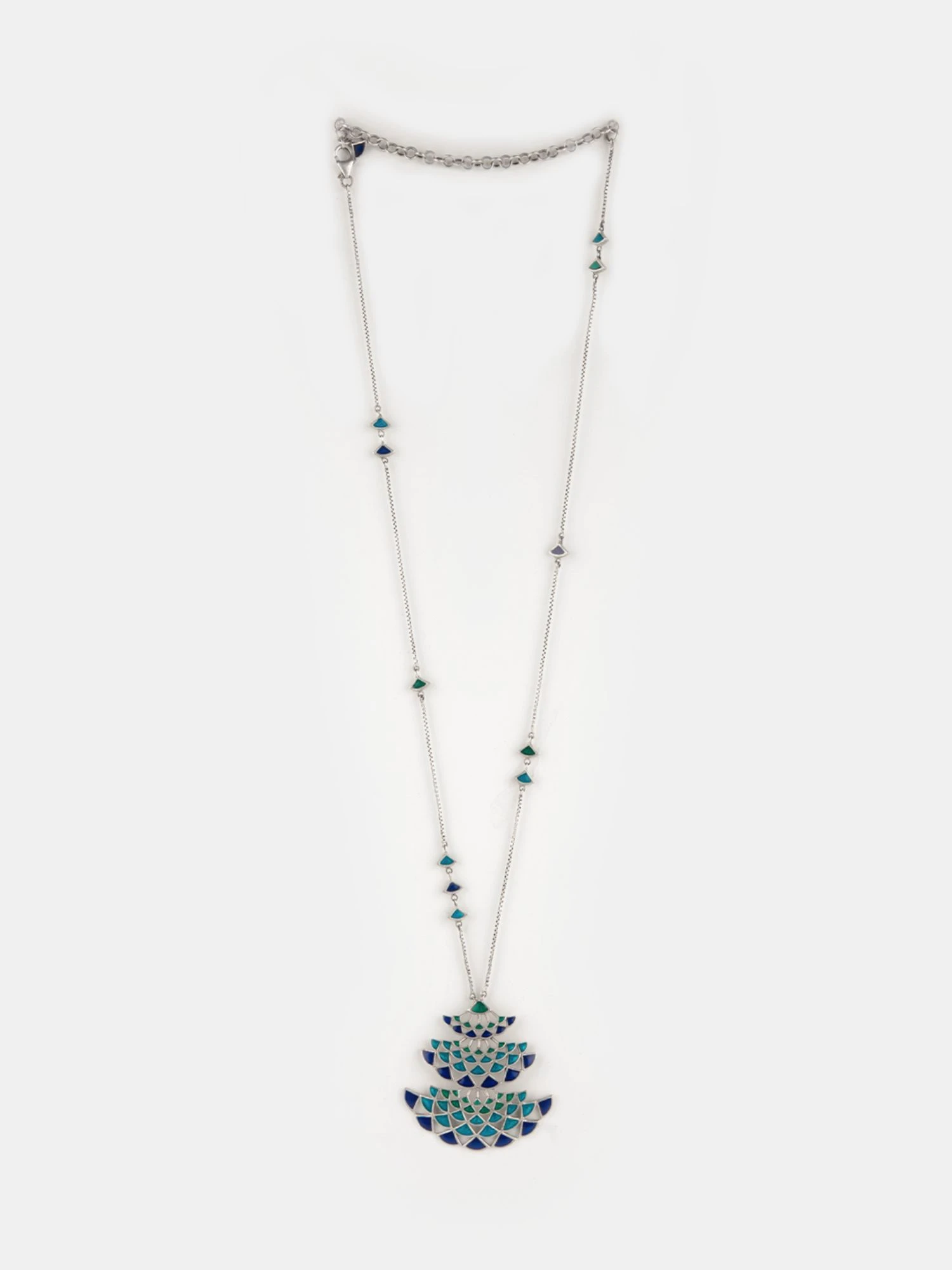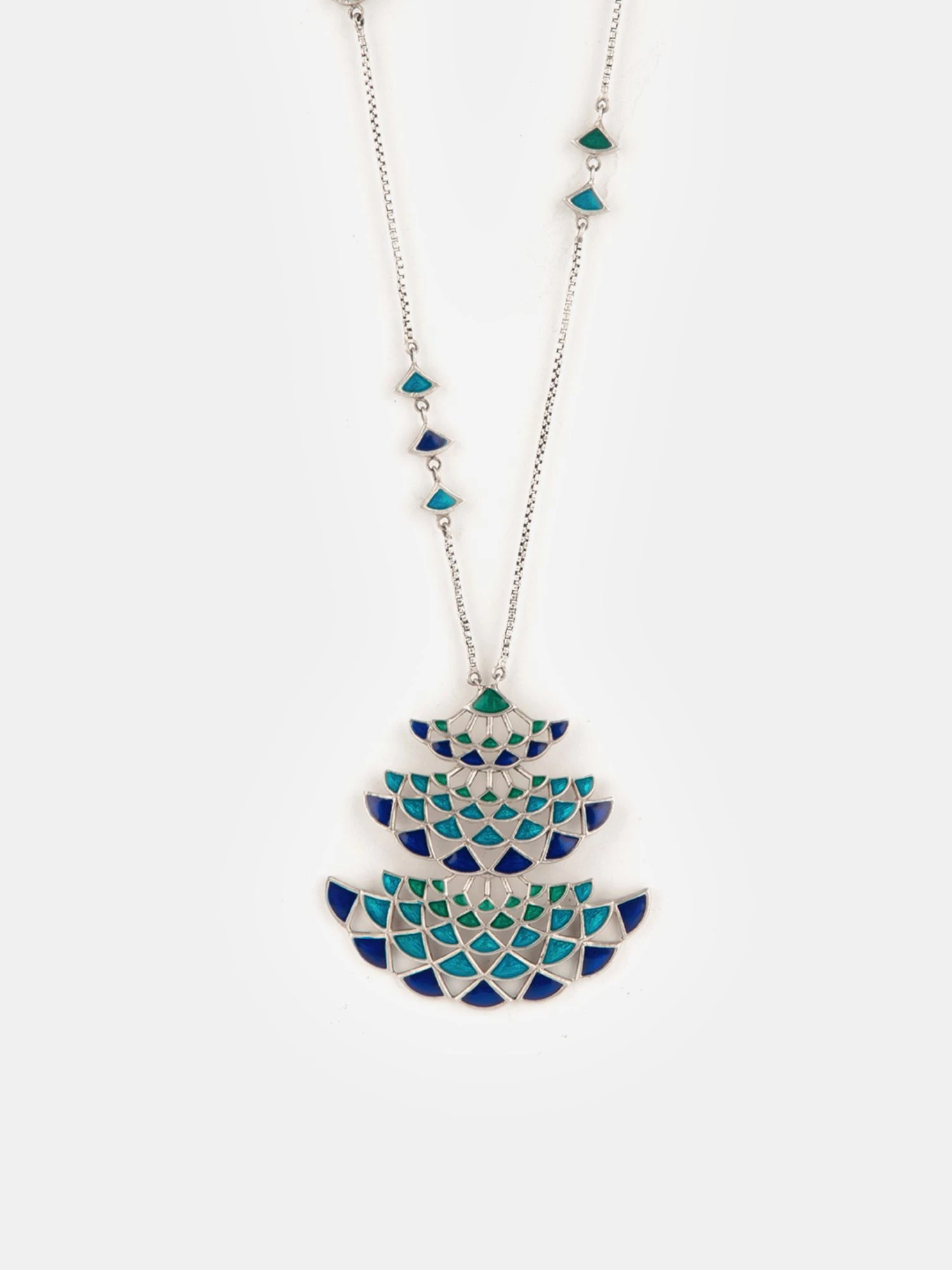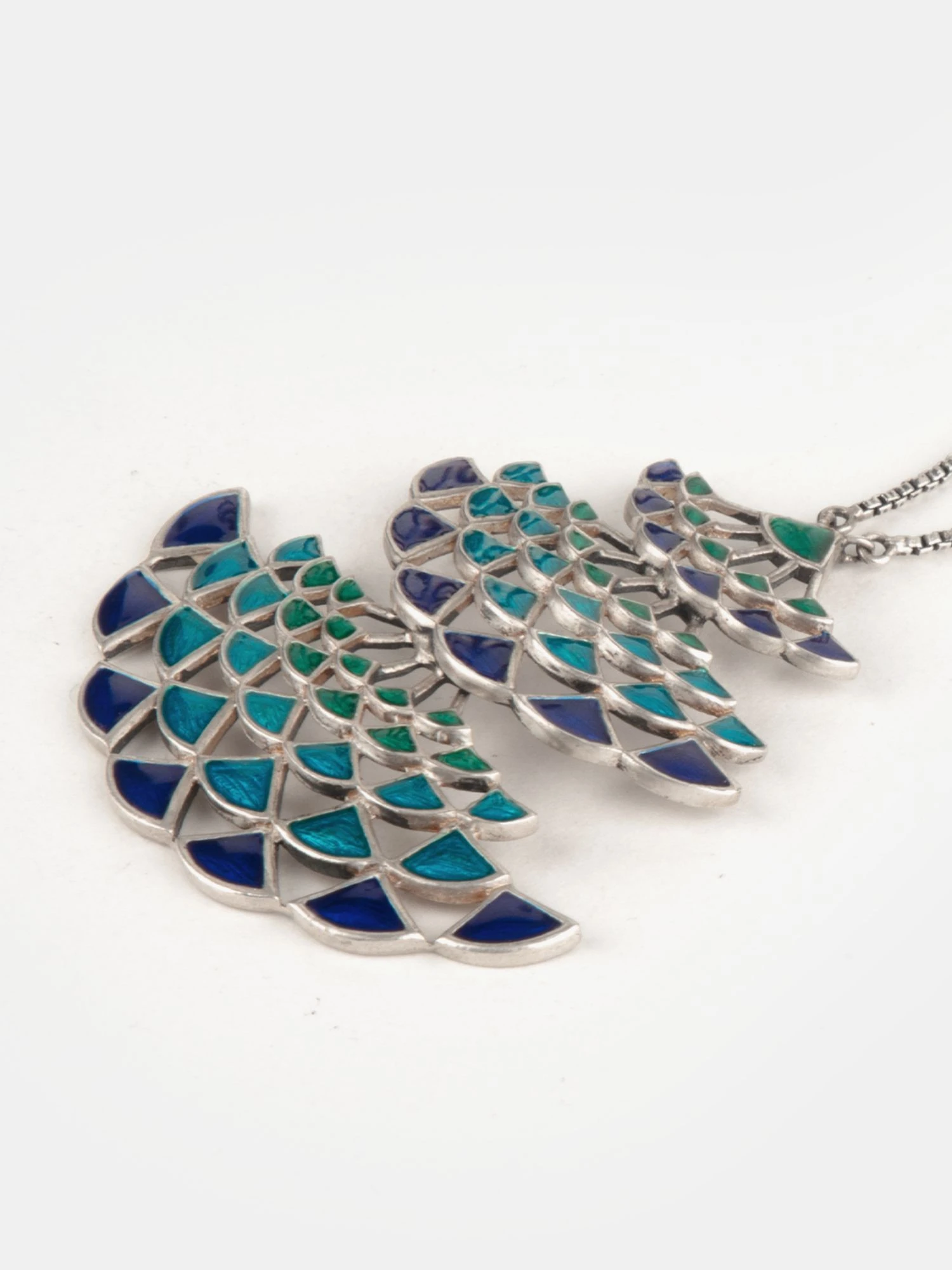 Silver Enamelled Pendant Necklace. Crafted in 925 Silver with a Shiny Oxidised Finish. Uniquely handcrafted, no two pieces are exactly alike! nn ‚Own Your Plumes‘ is a celebration of your unique style and expression. We’ve borrowed the flared forms and iridescent tones directly from the Peacock’s one-of-a-kind plumage and its uninhibited movement. nnCare Tips: The first step is to store your jewellery in a zip lock bag when you’re not wearing it. Also, avoid direct contact with chemicals such as perfumes, sanitisers and the likes.