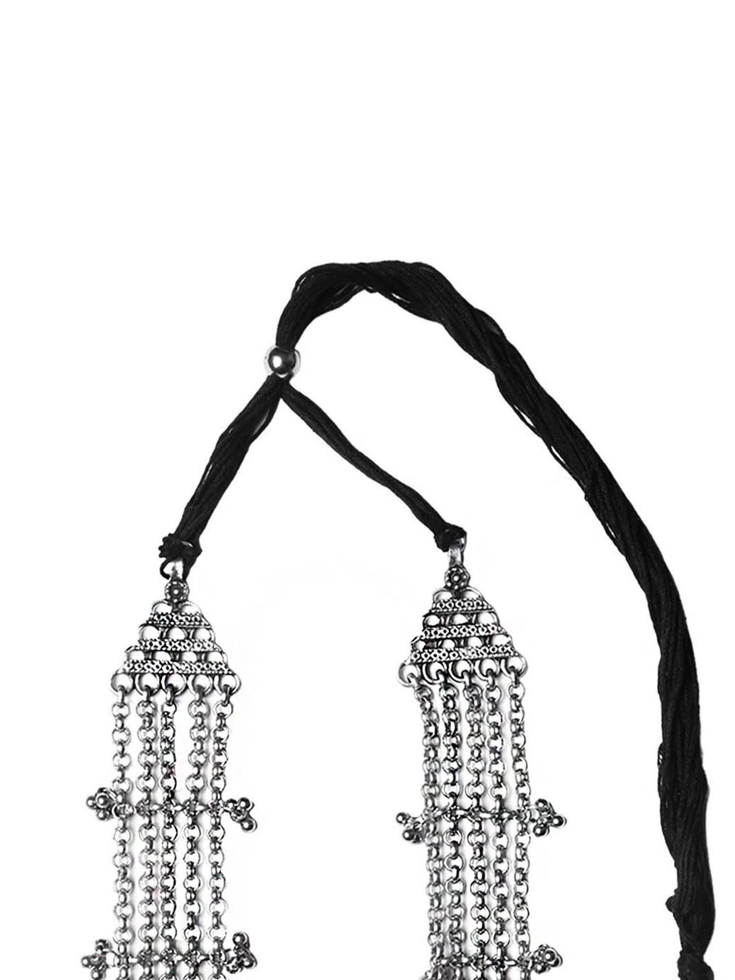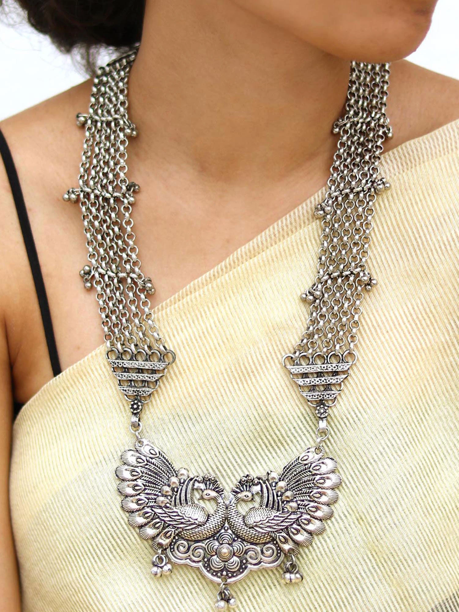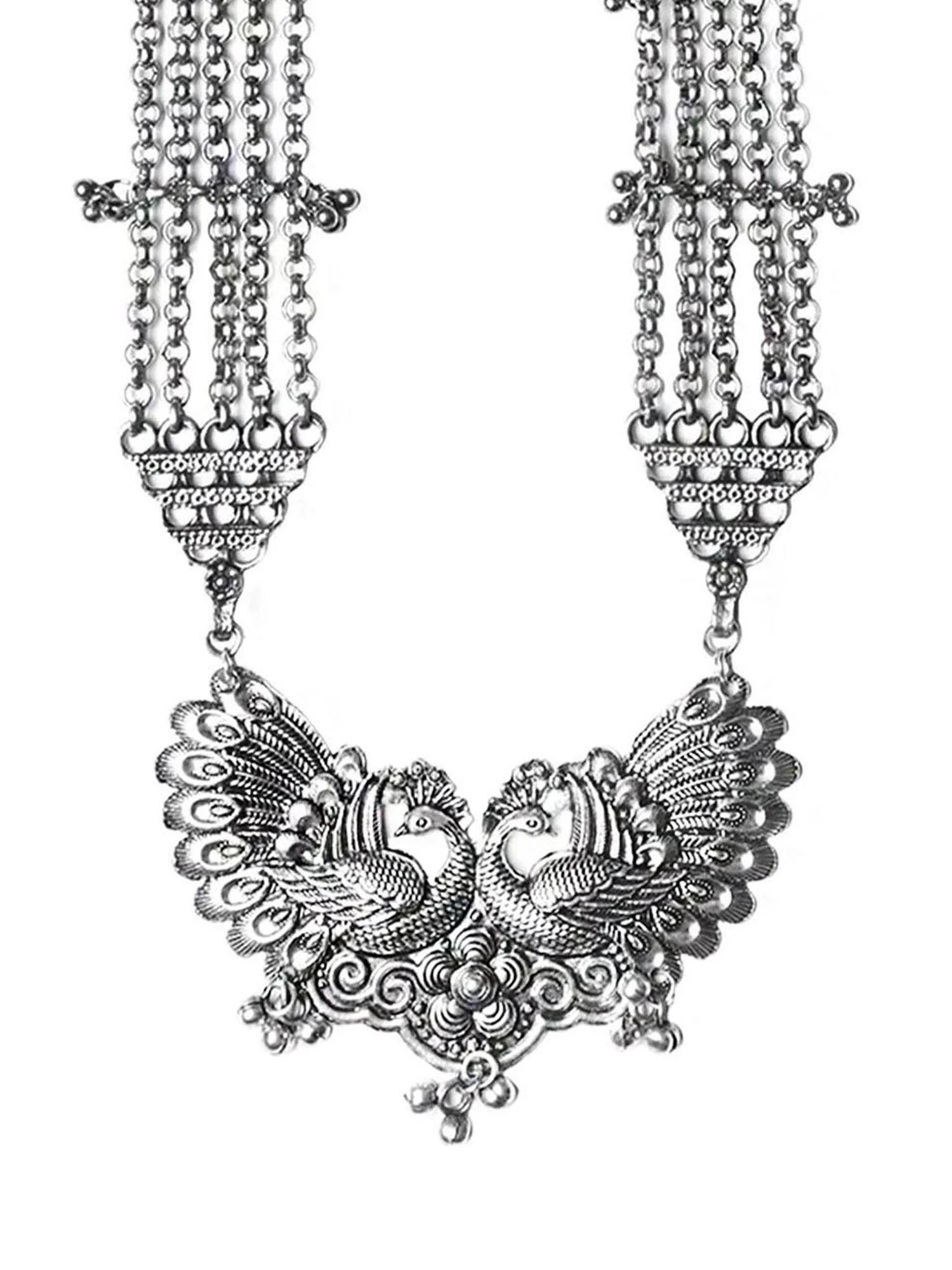 Awaken the mesmerizing goddess inside you with this silver necklace by Teejh. Designed with the finest material, this exquisite necklace is all you need to amp up your overall traditional ensemble. Team it up with a gorgeous kurta set, embellished jutties, and a potli bag for a perfect ethnic look.