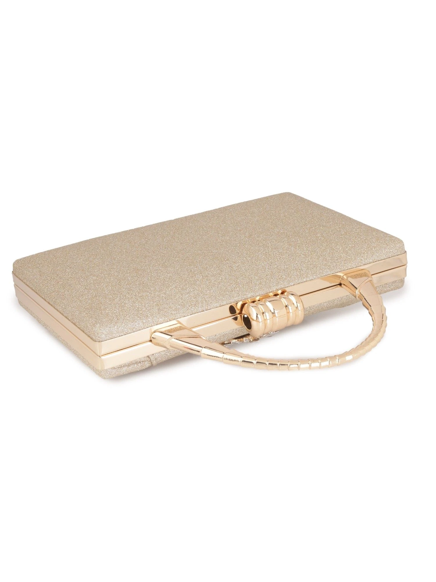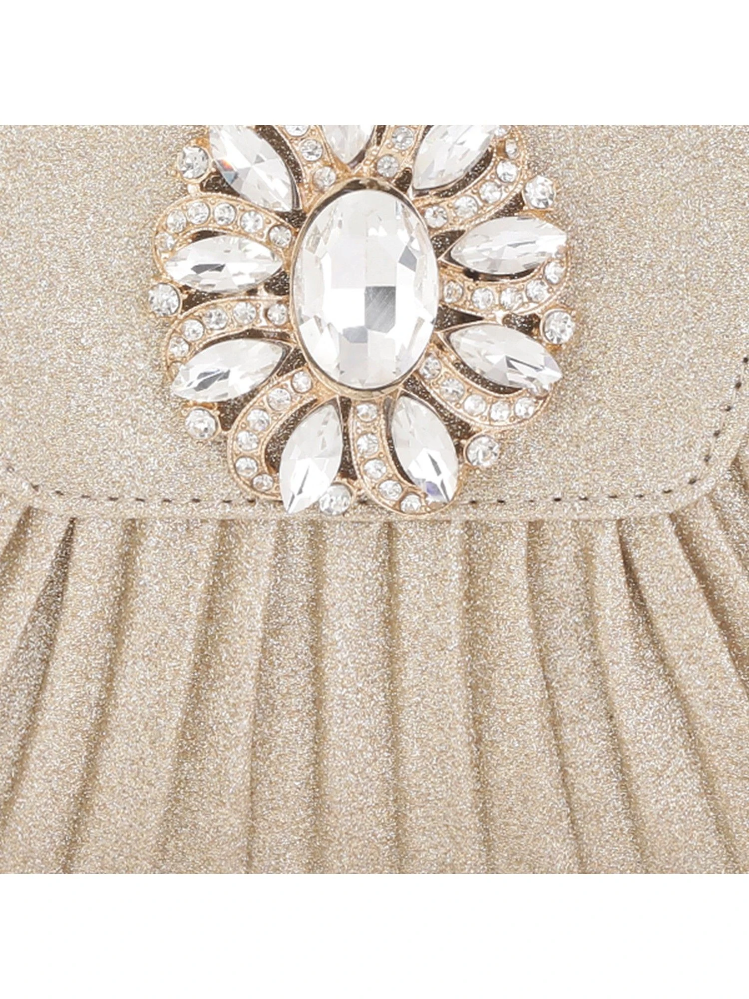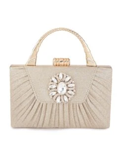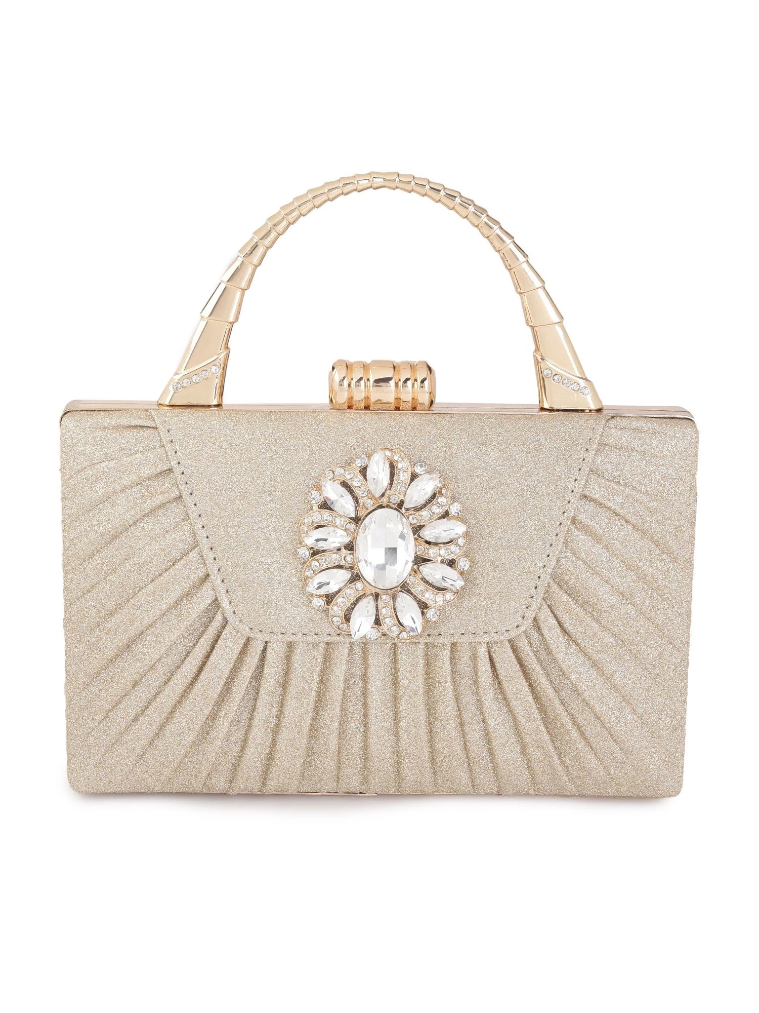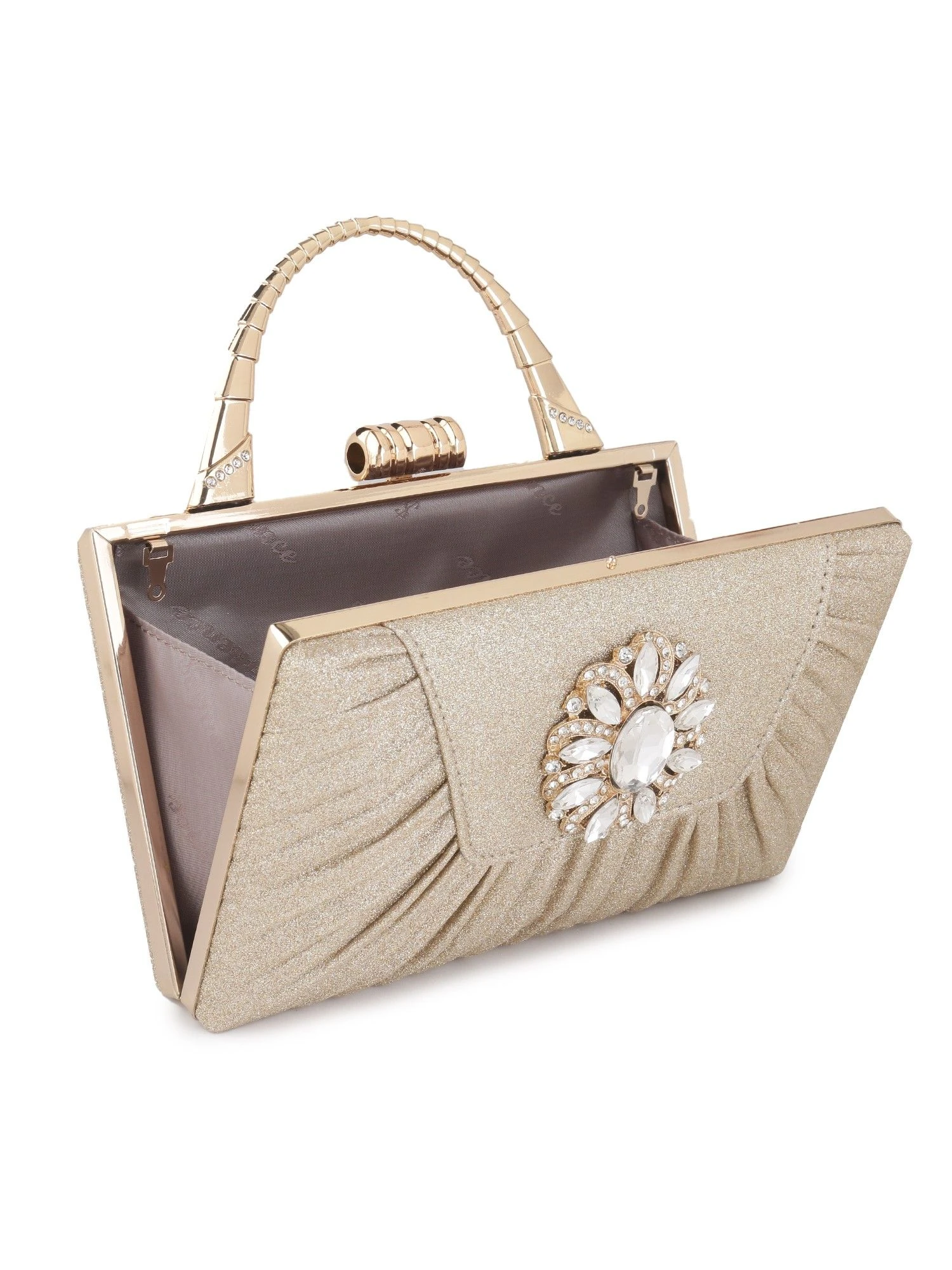 This exclusive TREASO clutch is made of premium shiny material and It consists of an exclusively imported metal frame , silk lining and a clasp closureThis trendy design also has a big crystal stud in center .This clutch is so versatile, it can be worn by women for a wedding, dinner party, evening out with family and friends and for a celebration of any kind and on any outfit too-be it Indian or indo-western. A must have for every woman in her wardrobe.It comes with a gold metal chain that can be attached and strung over the shoulder as a sling bag too. Dimensions : (L x B x H) : 20 x 4 x 15 cm, Number of Main Compartments : 1