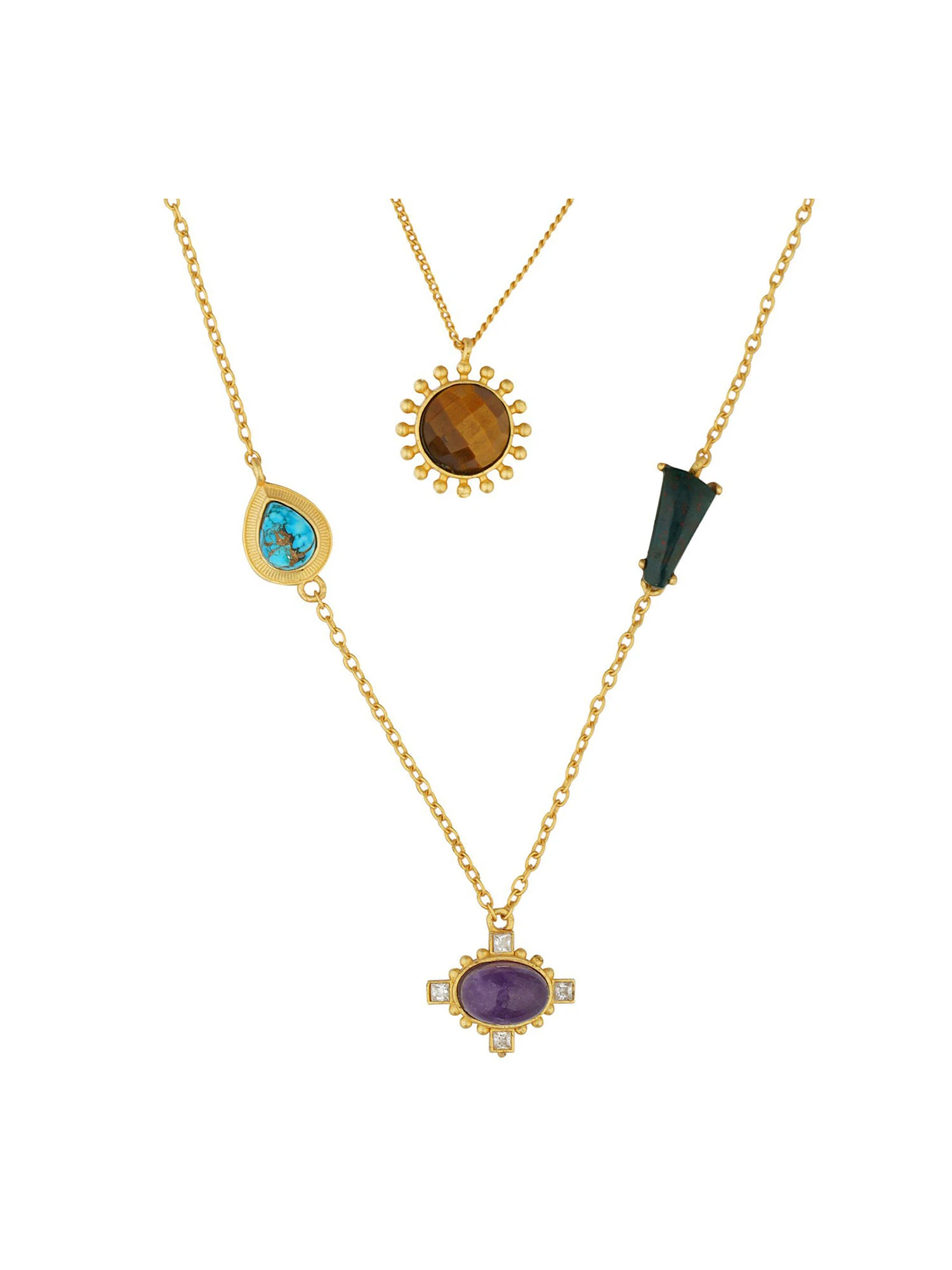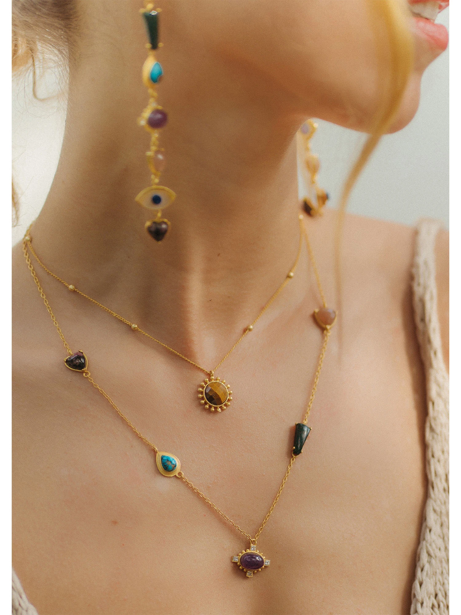 22kt gold dipped necklace with Amethyst for Crown Chakra, Turquoise for Throat Chakra, Rhodonite for Heart Chakra, Tiger Eye for Solar Plexus Chakra, Moon Stone for Sacral Chakra and Blood Stone for Root Chakra. The chakra gemstones enable you to indulge in some colour therapy and connect with the balance within.