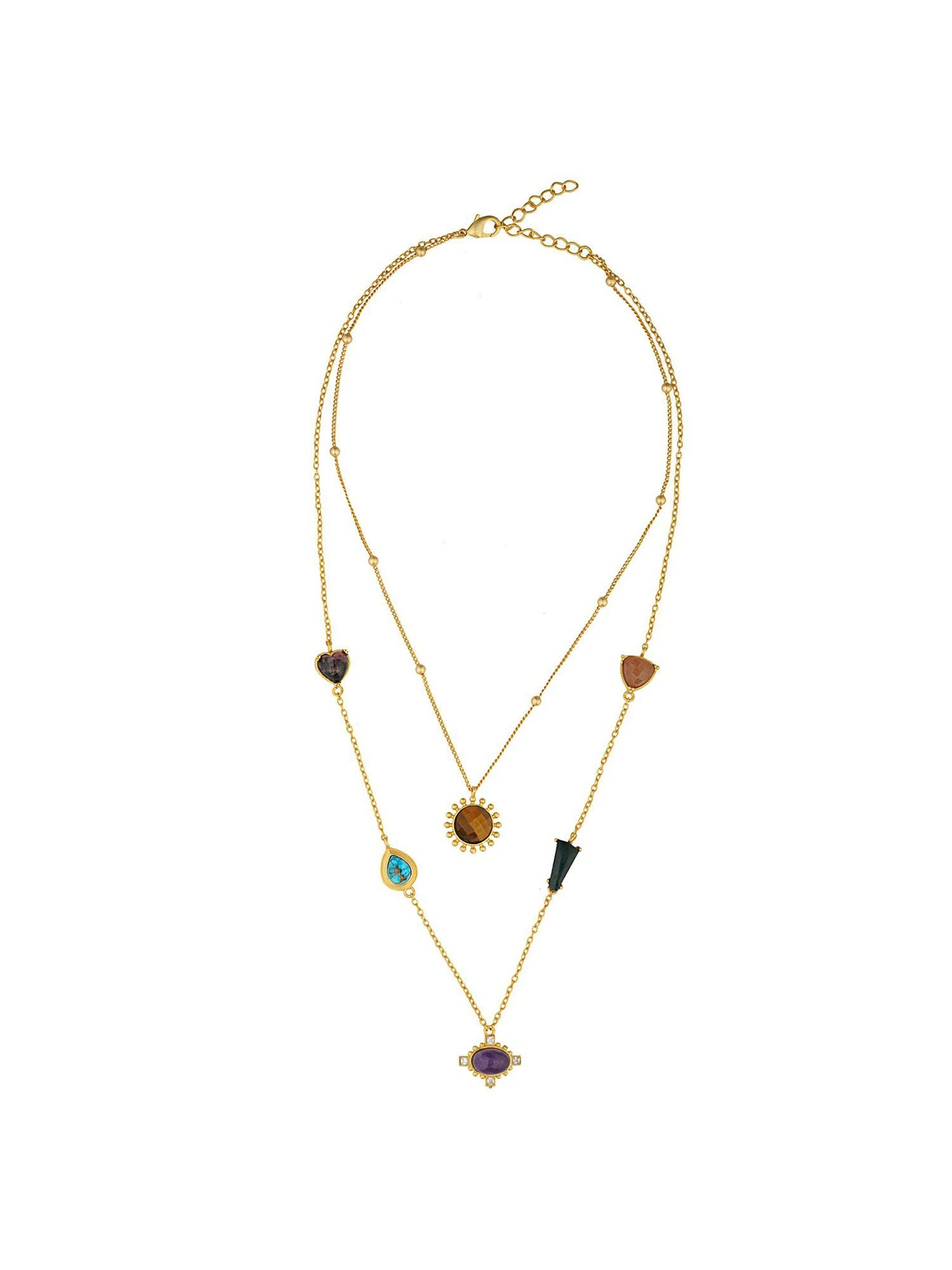Our love affair with pre-layered necklaces is an everlasting one! This is a delicate two layered piece with 6 rainbow gemstones.